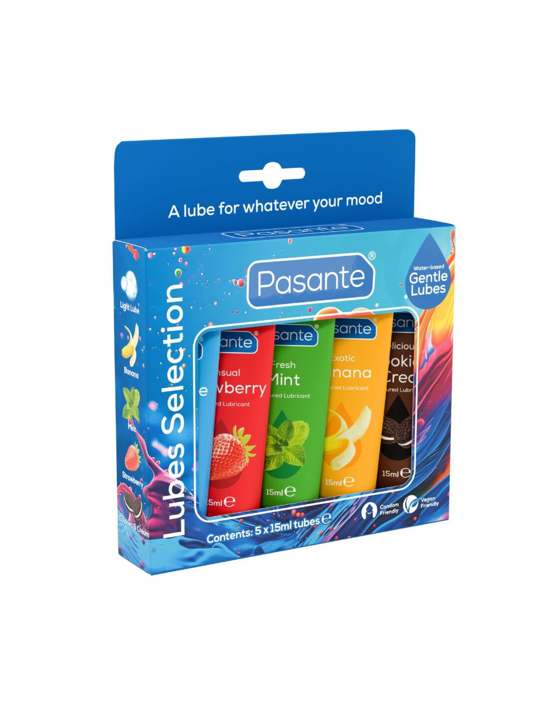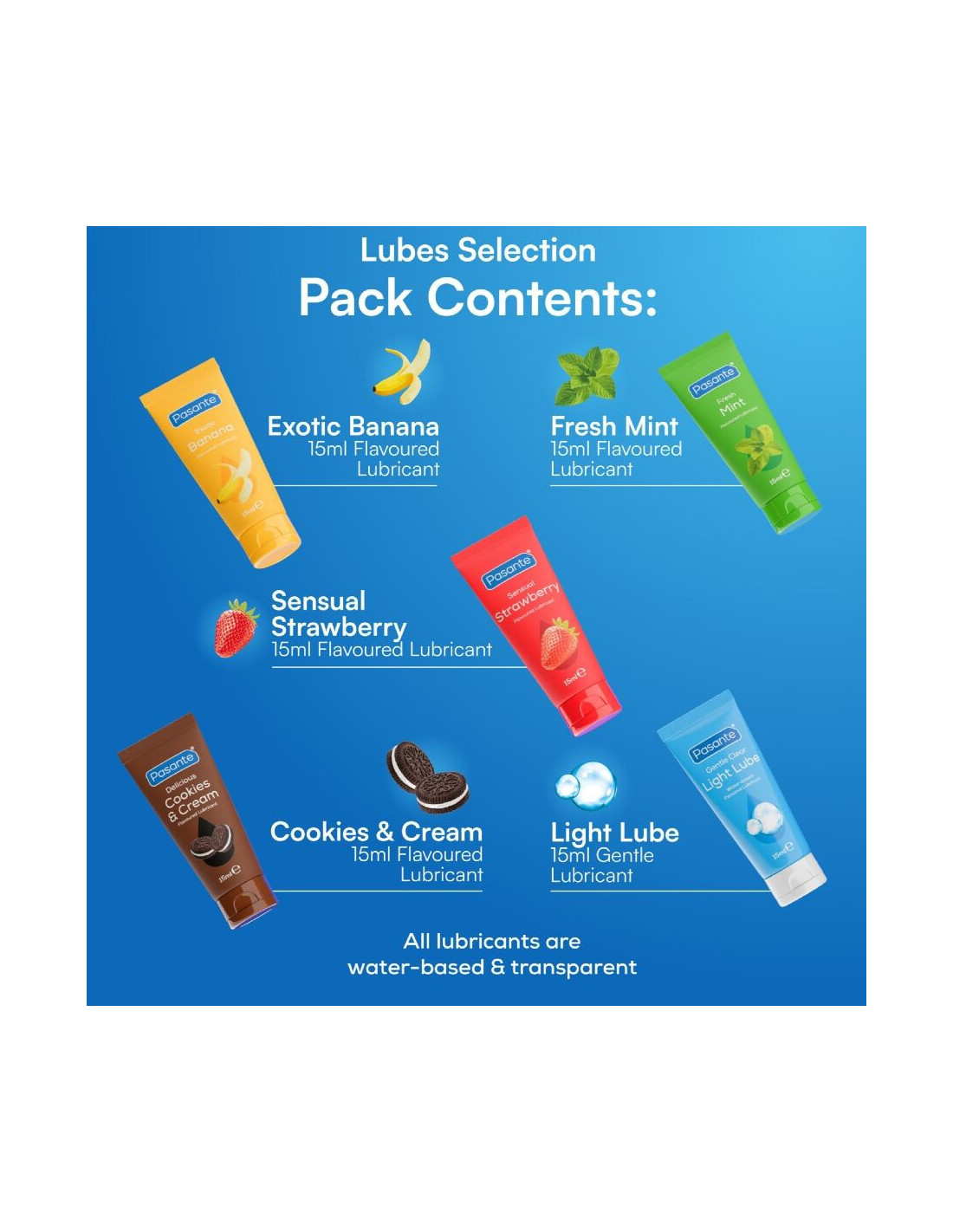 Explore new sensations, enjoy delicious flavors, and create unforgettable moments with your partner. Trust Pasante to provide you with the highest quality lubricants that are safe, reliable, and enjoyable. Inside the fun pack you'll find a variety of 15ml personal lubricant tubes including: