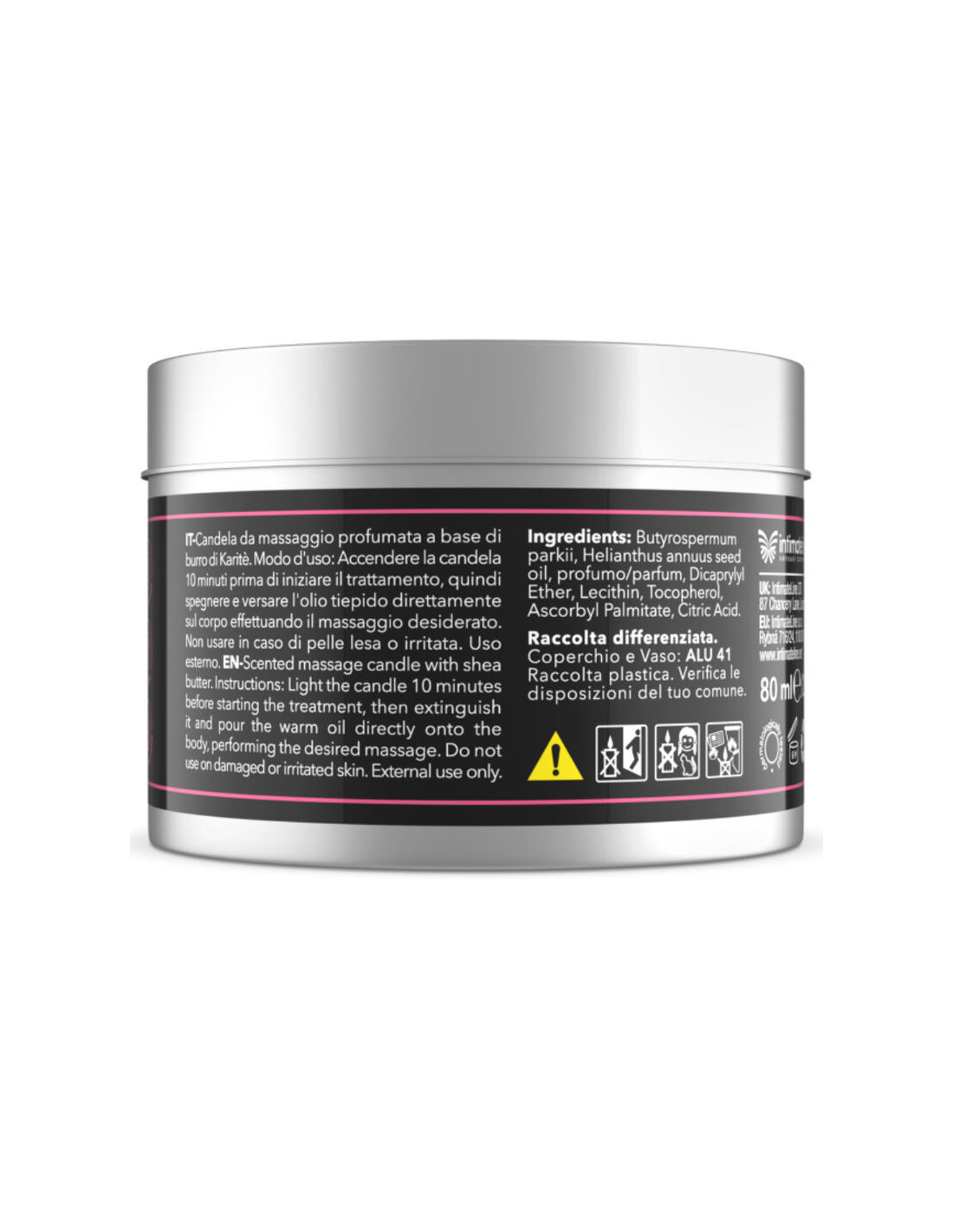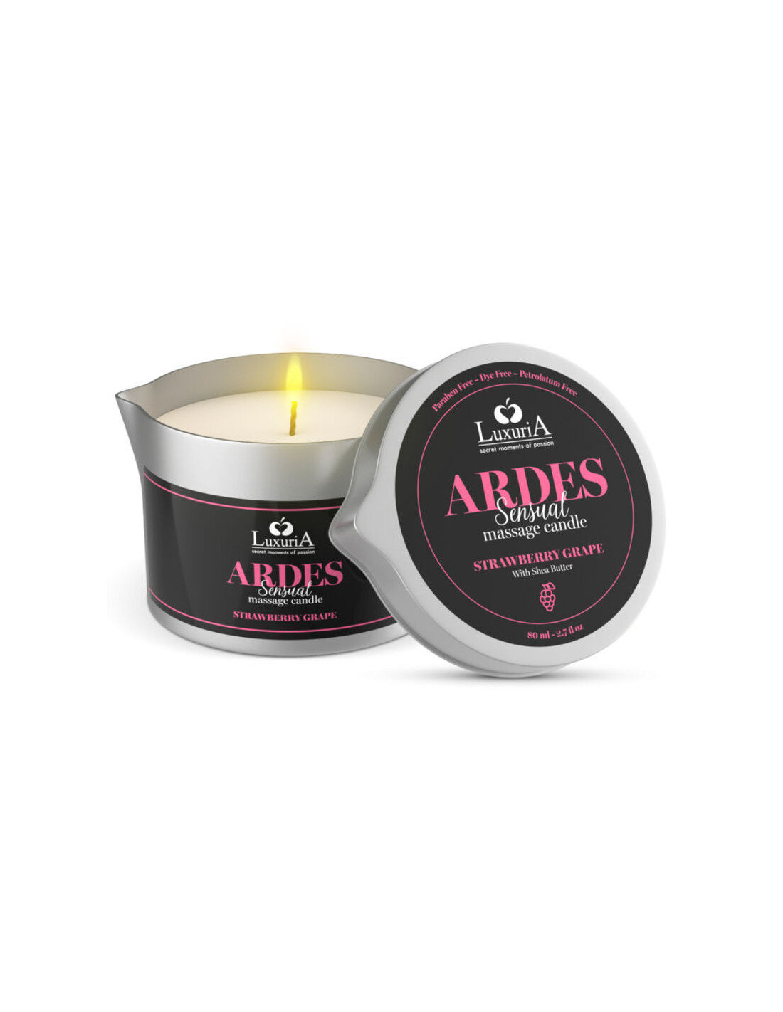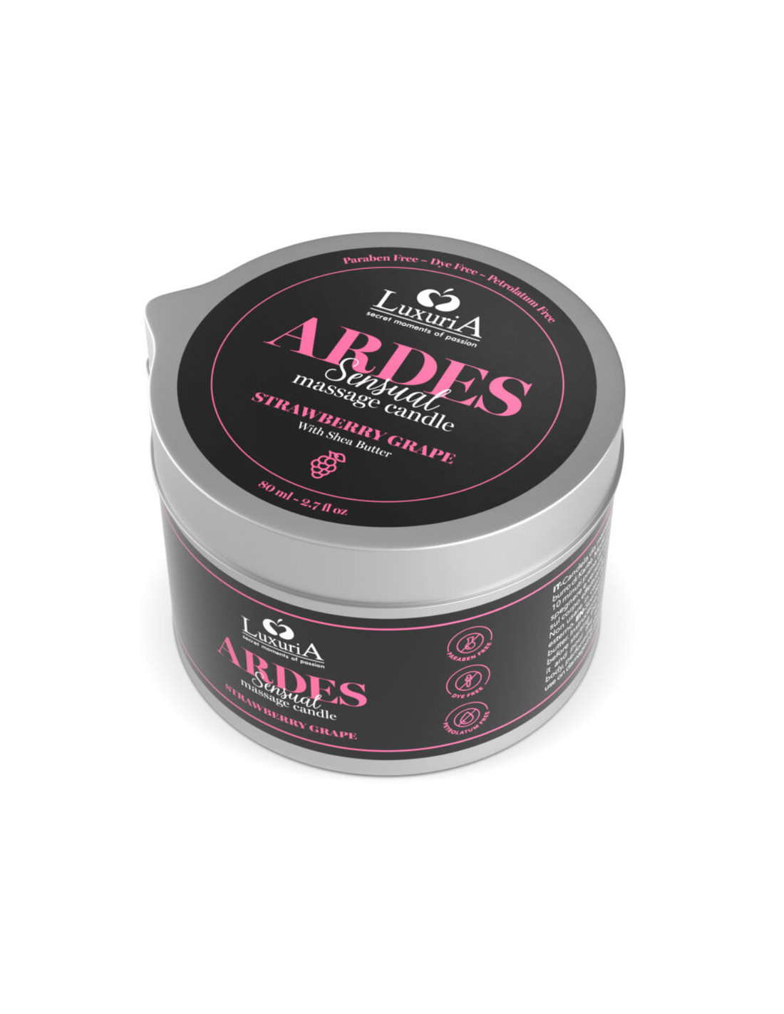 Luxuria Ardes Grape/Strawberry Massage Candle is a scented massage candle made with shea butter, enriched with sensual aromas to intensify and stimulate intimate relationships. The firming and emollient properties of shea butter will provide relief and softness to your skin. The intoxicating aroma of its fragrances will envelop you in warm and sensual moments full of passion and excitement. Ardes will ignite a lustful atmosphere taking you to a sensorial dimension of erotic pleasure.