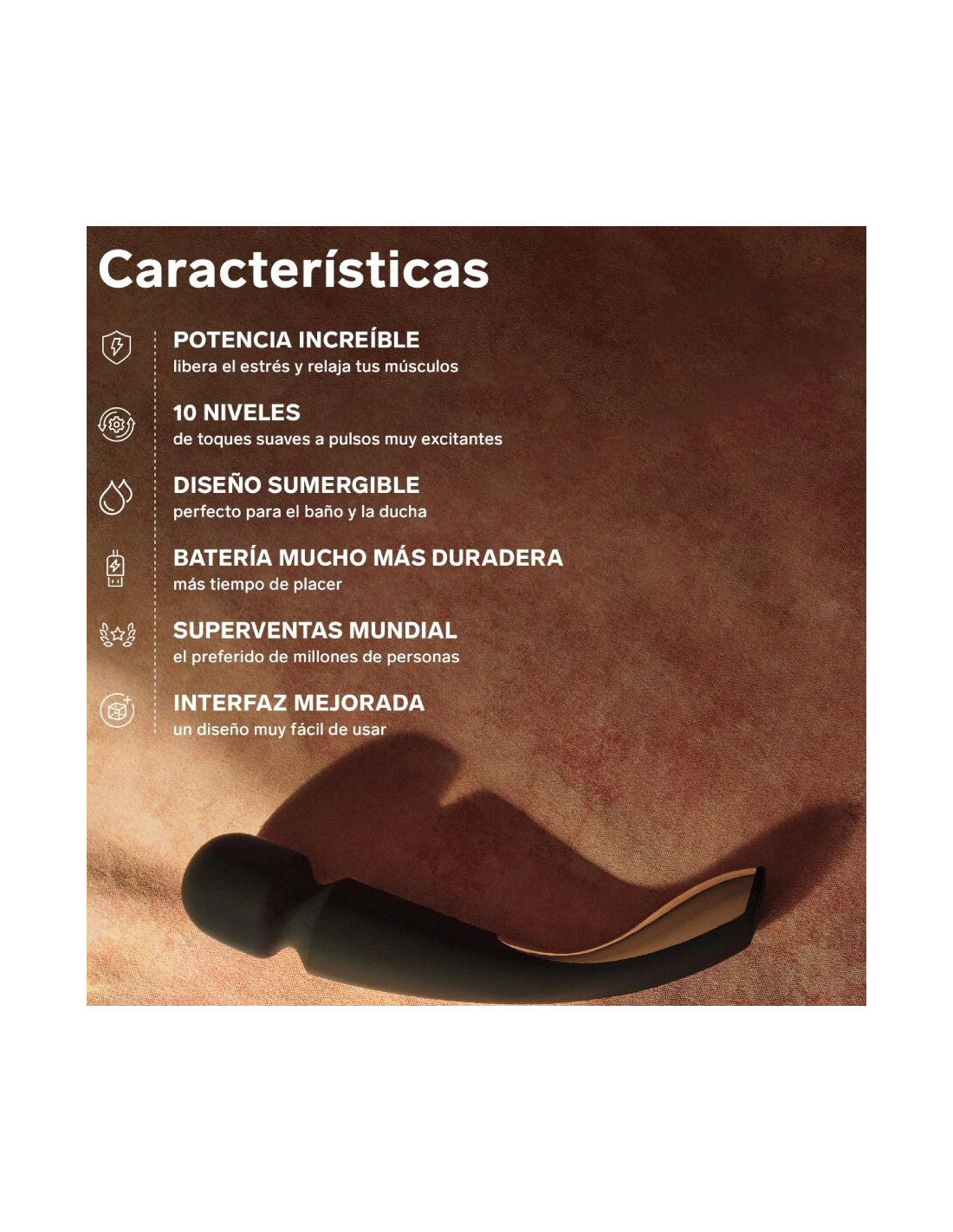 With a perfected design, this powerful massager has ten different vibration patterns that help relax muscles and enhance sensations in any part of your body. Now with a more stable handle and an even longer lasting charge, so you can enjoy hours and hours of pleasure and rest in the most peaceful orgasms.