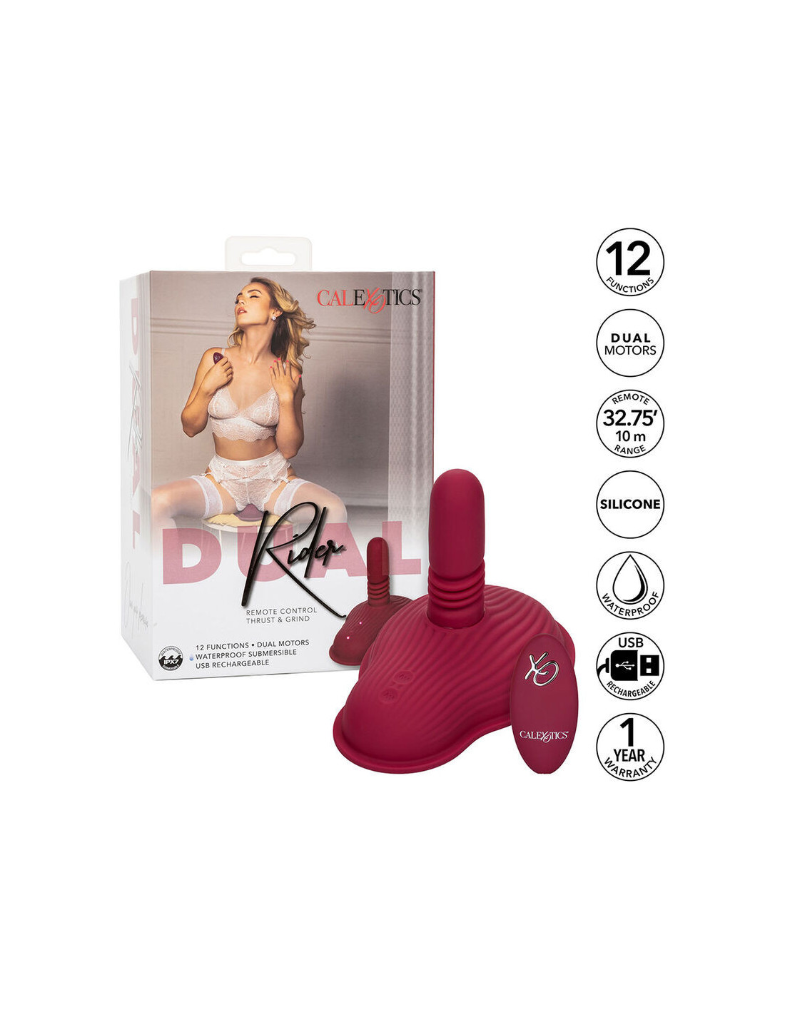 CALEXOTICSOwn your pleasure with the Dual Rider Remote Control Thrust & Grind, a remote-controlled dual-motor massager designed for self-love and exploration. Delight your senses with 12 intense vibration functions, a powerful 3-speed thrust shaft, and an intimately ribbed design worthy of grinding. The sensual contour massager is Lined with a provocative grinding texture and a thrusting shaft for deep, rumbling stimulation. Use the remote control or easy-touch buttons to cycle through the 12 vibration functions and 3 independently controlled thrusting speeds. Take the ride of a lifetime and enjoy the pleasure just the way you like it with independently controlled electric motors. An easy-touch remote control makes cycling through orgasmic options a breeze. Take this waterproof massager for a dip and enjoy powerful vibrations anywhere you want to get wet, or use the fun remote control to enjoy a range of up to 32.75 feet 10 meters away. Premium silicone is body-safe, unscented, and phthalate-free to keep your most sensitive spots happy and healthy. Recharge the premium silicone massager in 3 hours with the included USB charging cable to enjoy 55 minutes of high-speed stimulation or 100 minutes of low-speed vibrations.