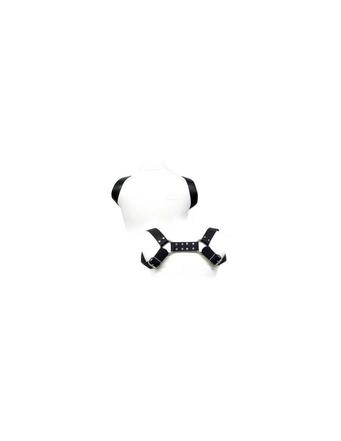 Practice BDSM with this leather harness for men, linked to the adjustable shoulders