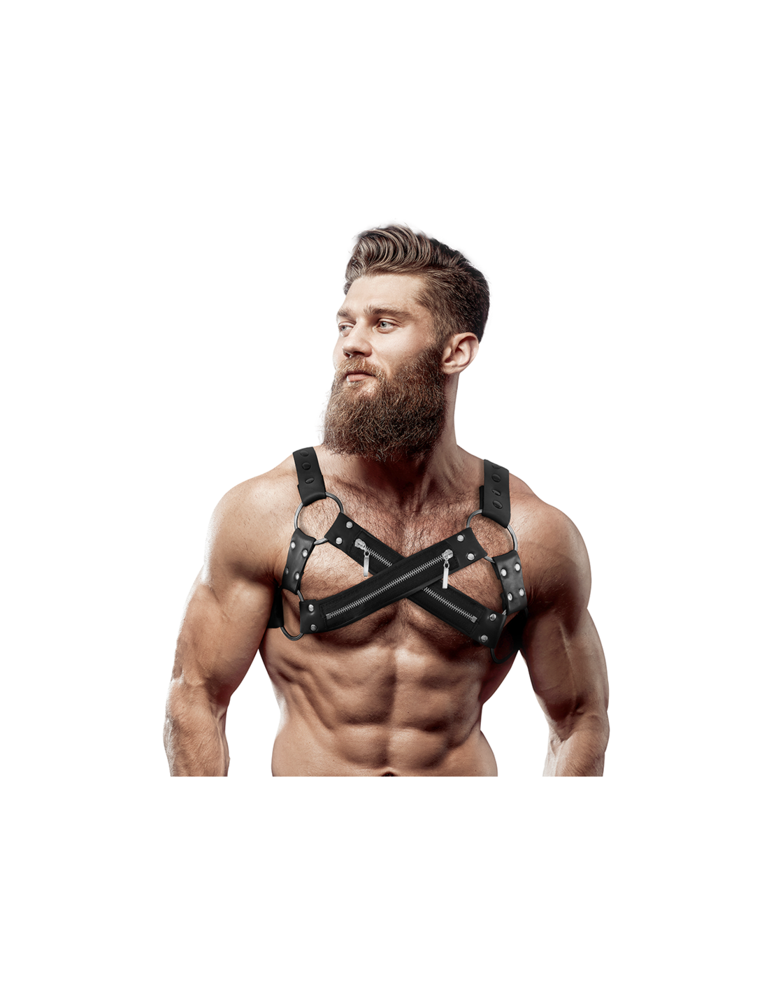 FETISH SUBMISSIVE ATTITUDE - ADJUSTABLE NEOPRENE CROSS-OVER CHEST BULLDOG HARNESS WITH ZIPPERS FOR MEN