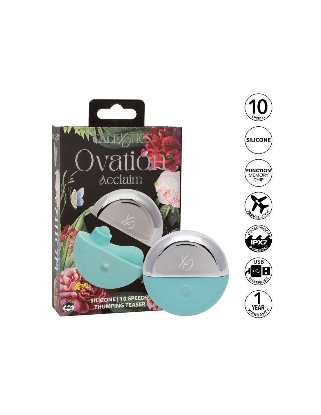 CALEXOTICSExperience intense pleasure with the Ovation Acclaim, which features ergonomic curves for precise stimulation. Explore 10 pulsating speeds for diverse sensations. Its discreet magnetic case guarantees privacy. Made with body-safe silicone, it's waterproof and submersible for bath time fun. With a memory chip, it remembers your last settings, and a travel lock feature ensures worry-free transportation. Stay powered with USB recharging, providing 45 minutes of pulsations at high speed or 70 minutes at low speed.