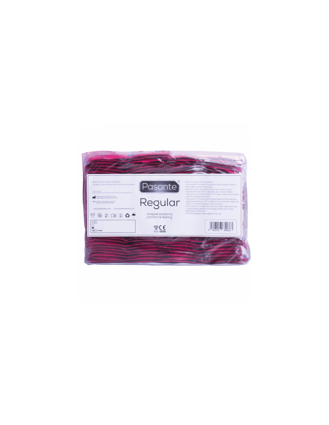 Pasante Regular condoms have a slight tapered shape for a natural feel. Soft, natural-colored and with a teat tip.