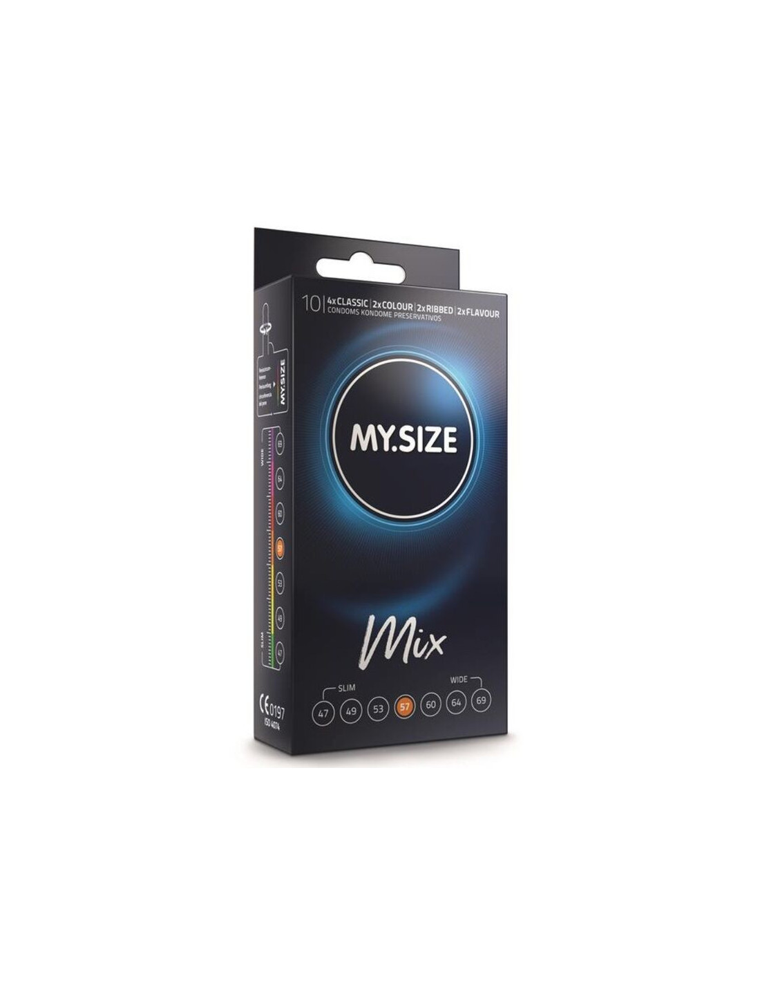 - THE DEAL: 10 MY.SIZE condoms in 4 variations: 4 Classic, 2 Ribbed, 2 Flavor, 2 Color. 57 mm. CE marking. In compliance with EU Directive 93/42/EEC on medical devices. Available in other nominal widths. Free online gauging app included.