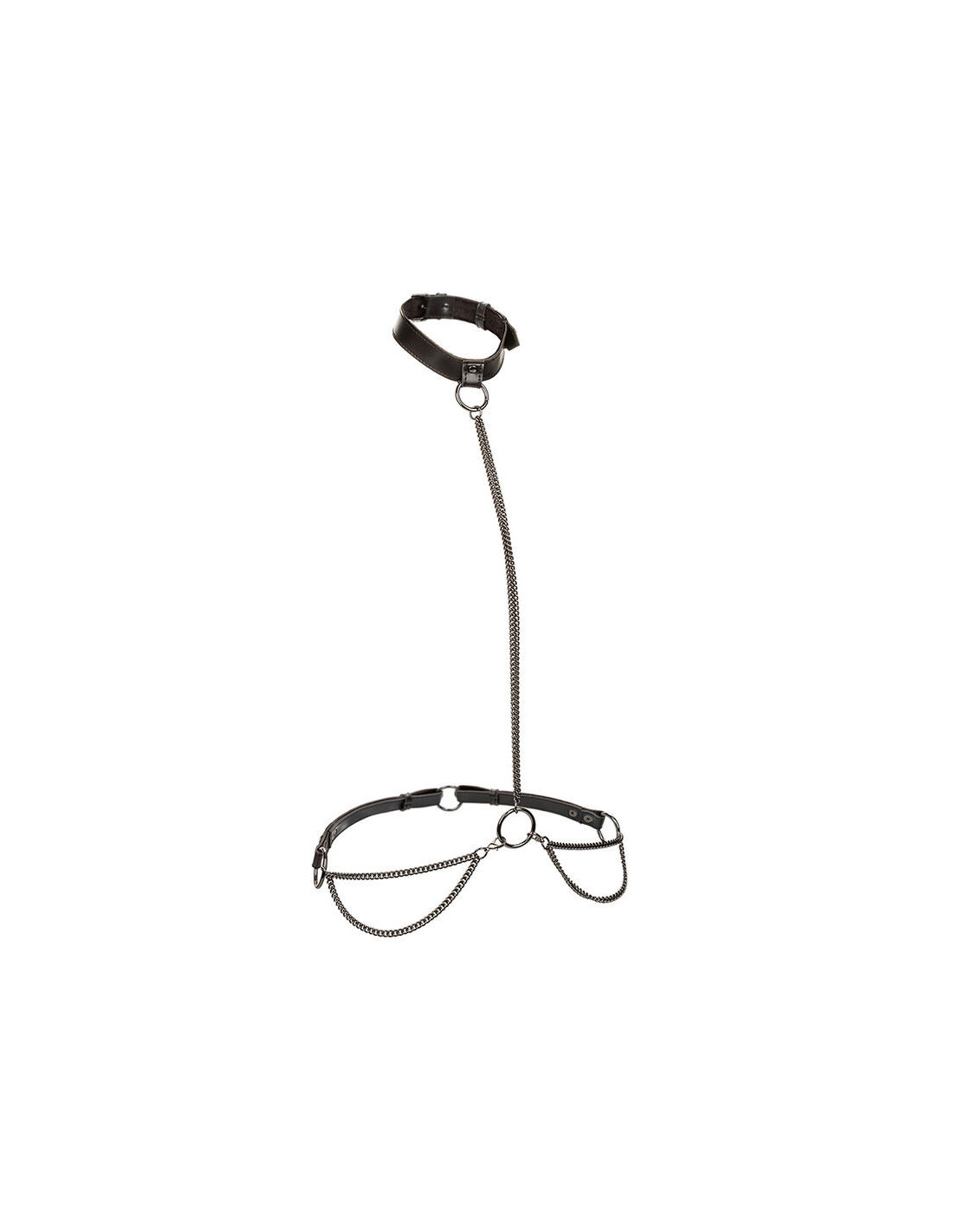 The multi-chain harness seamlessly transforms into a commanding collar and leash, aimed at the bold, beautiful, and fearless.