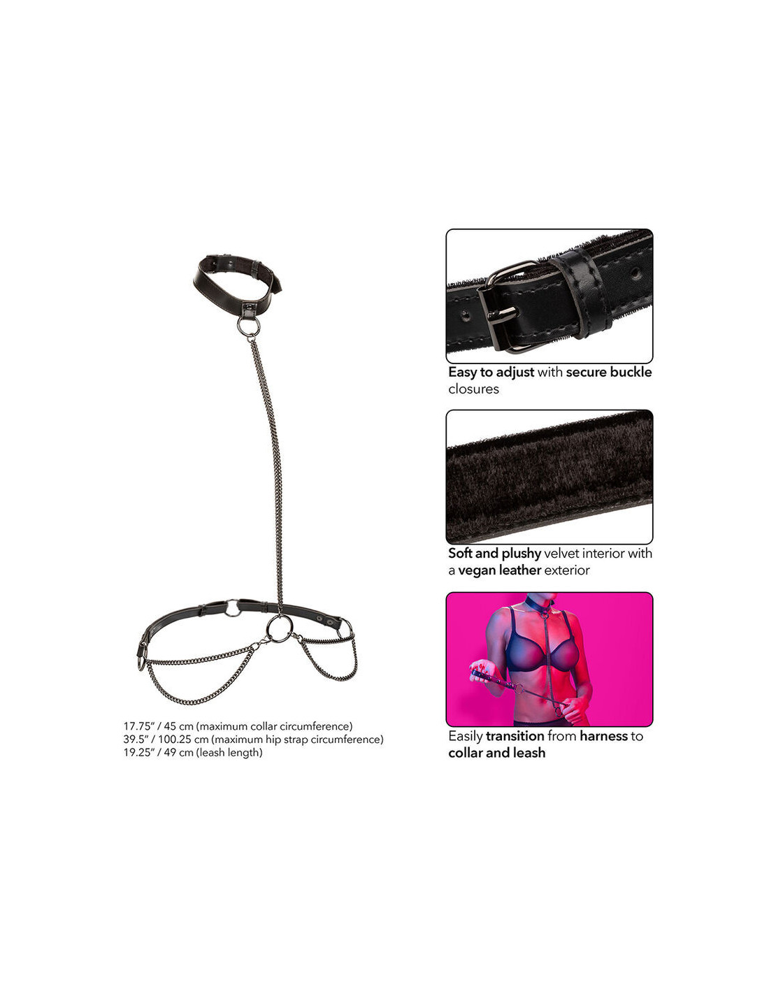 Adjustable buckle closures ensure a perfect fit, balancing comfort and control. Sturdy metal chain ensures durability. Fluffy velvet lining offers comfort, while vegan leather exterior adds elegance. Universal clasps and O-rings provide versatility, and double padding and stitching promise strength. Nickel-free metal accents accommodate all skin types.