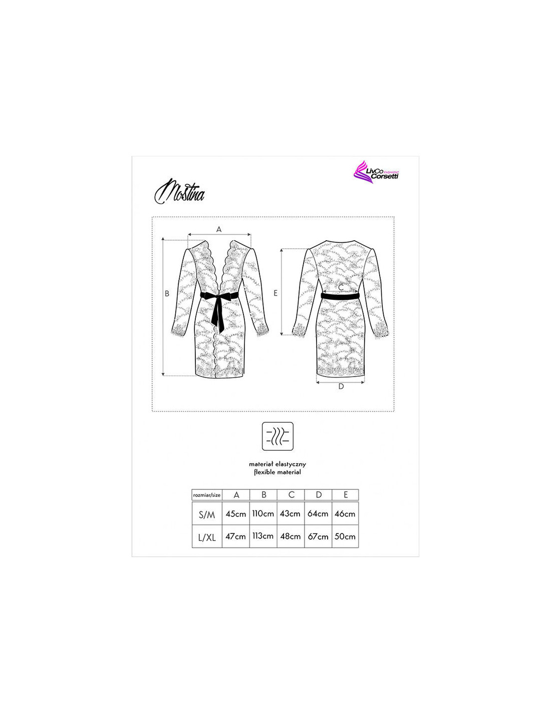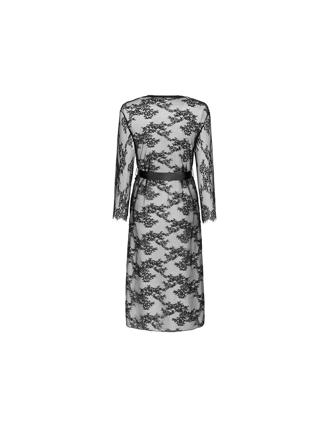 LIVCO CORSETTI ACCESORIESA dream bathrobe for women who like sensual lingerie. Attractive, sexy, black, mid-calf length. The material from which the dressing gown is made is polyamide. Transparent, with a delicate floral pattern. The bathrobe has long sleeves and decorative trim on the front and sleeves. A wide, black sash that can be tied around the waist adds great charm and original appearance. Slightly open, it will look alluring, seductive and very pretty. It goes beautifully with black or red lace underwear. It will be the perfect outfit for a strip date. Made of non-creasing material, it fits perfectly to the body and does not crease. If a woman wants to feel comfortable and dreams of charming the man in her life, this sensual bathrobe will be a perfect choice. The product can be a great gift for a girlfriend on Valentine's Day, for a young wife on a wedding anniversary or another occasion. Offered by a loving man, it will surely bring a woman great joy.