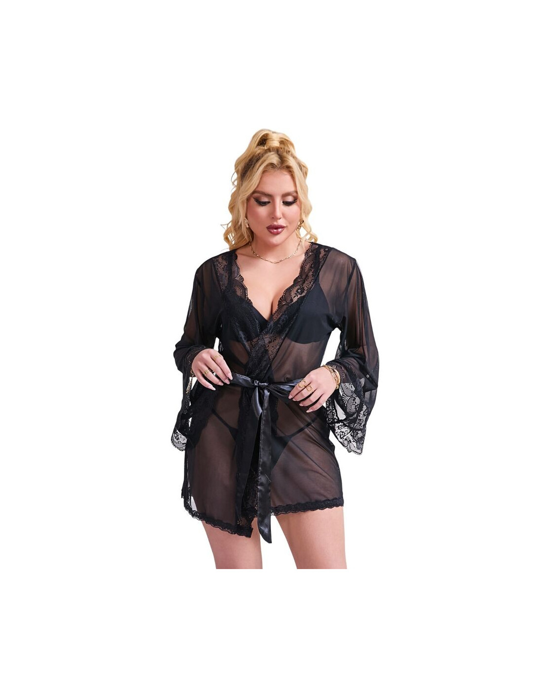 SUBBLIME - TRANSPARENT FABRIC ROBE WITH LACE DETAIL BLACK S-M