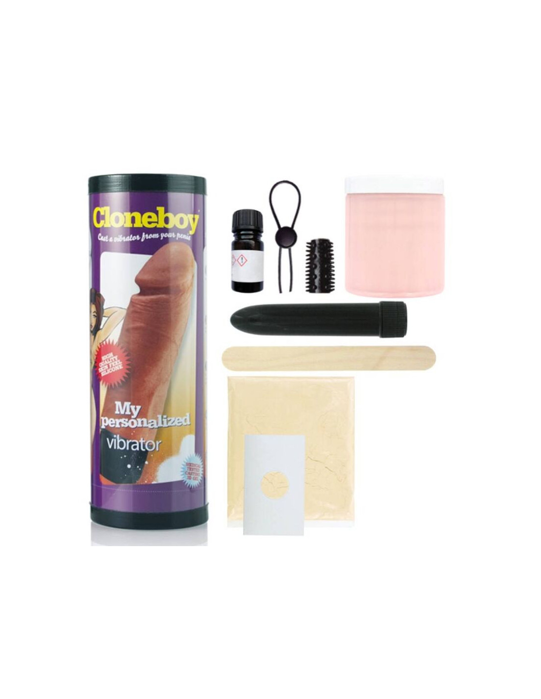 The Cloneboy Cast Your Own Vibrator kit contains all the necessary items to make a vibrating silicone rubber copy of your penis either alone, or together with your partner. The Cloneboy contains no plaster that can irritate the skin and uses a medically tested moulding material made from natural algae.