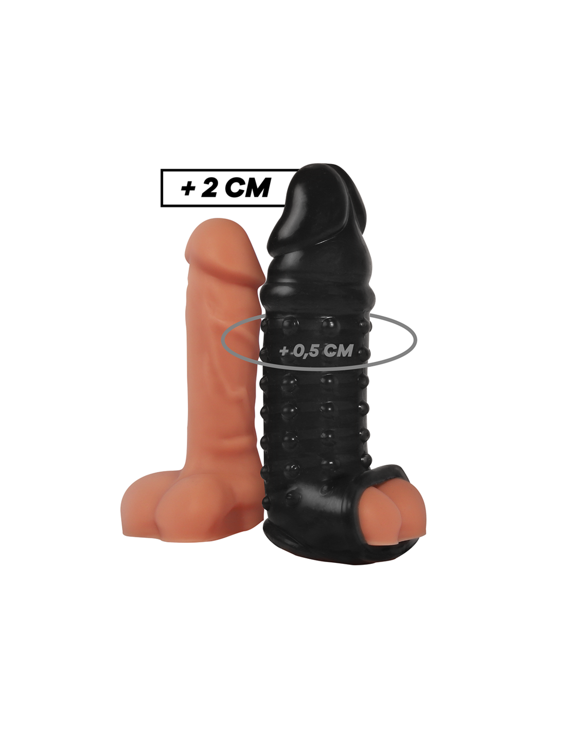 Fulfill exciting fantasies when you slide your penis into the sheath and your scrotum into the strap. Once this extension sleeve is secured, you will have more length and girth to play with in full support.