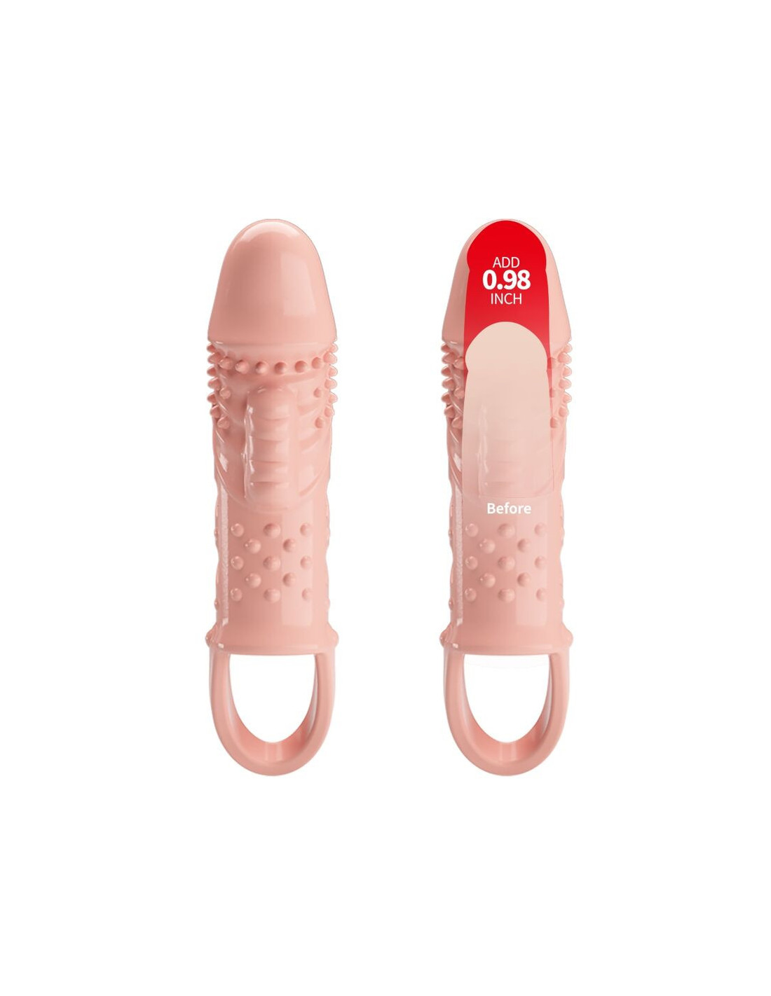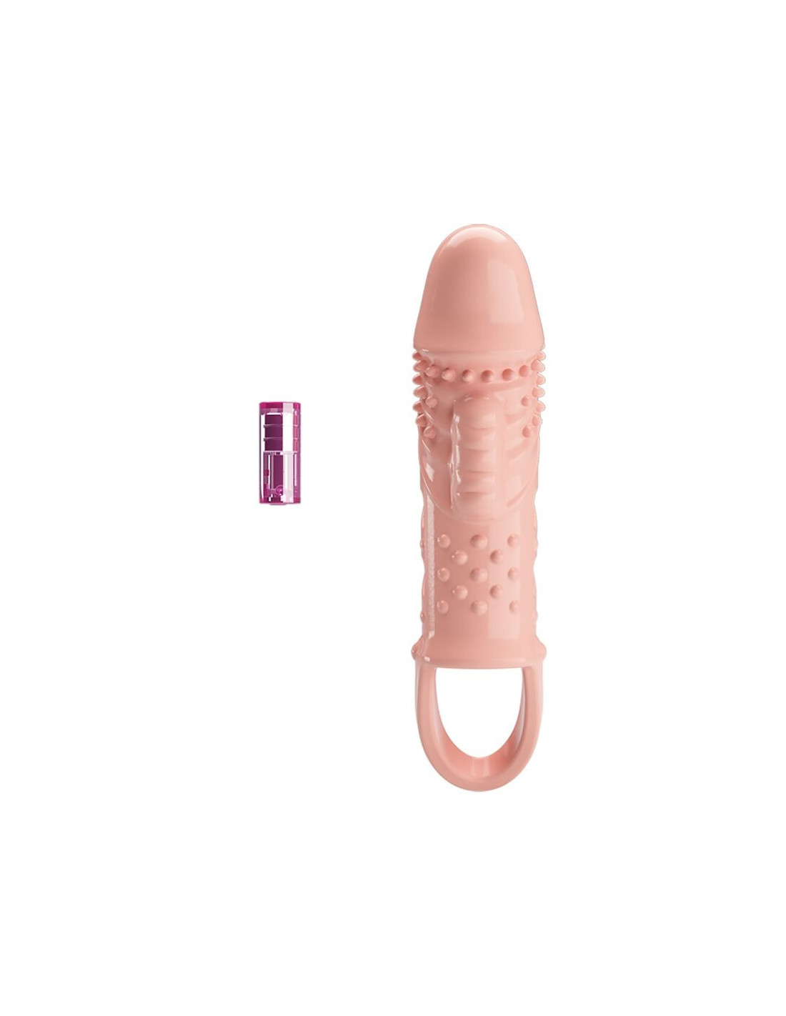 Have fun with this vibrating penis sleeve. This erection-enhancing and pleasure-promising penis sleeve is made of soft TPR and is secured in place by a ball loop. A vibrator at the tip extends the length of your penis and is activated on contact. By stimulating the head of your shaft, you also provide internal stimulation for her. The stretchy sleeve wraps around your penis for a stronger, longer-lasting erection, giving you more time to enjoy the vibrations!