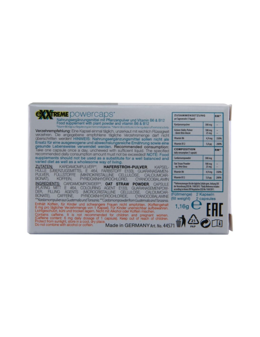 Cardamom powder, Oat Straw Powder, Capsule: (Plating Mitt E 464, Colouring Agent E133), Guarana semen powder, Filling Agents: (Microcrystalline Cellulose, Calcium carbonate), Caffeine, Pyridoxine hydrochloride, Cyanocobalamin.
