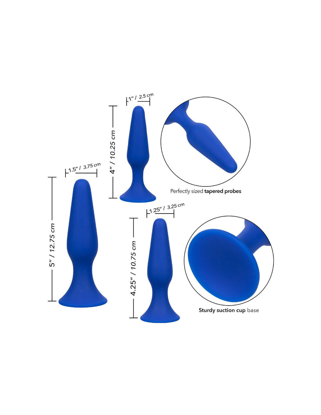 Experience heightened pleasure with the Admiral Anal Training Kit, which includes three premium silicone probes in graduated sizes for gradual exploration and expanded anal pleasure. Meticulously designed with a conical shape, each probe ensures a comfortable and stimulating insertion. The firm yet flexible silicone construction offers a pleasurable experience, with a superior suction cup base for hands-free fun and stability.