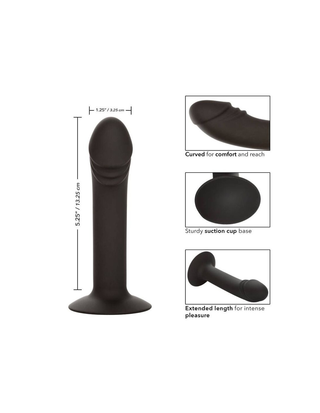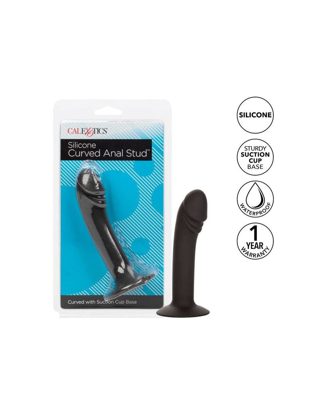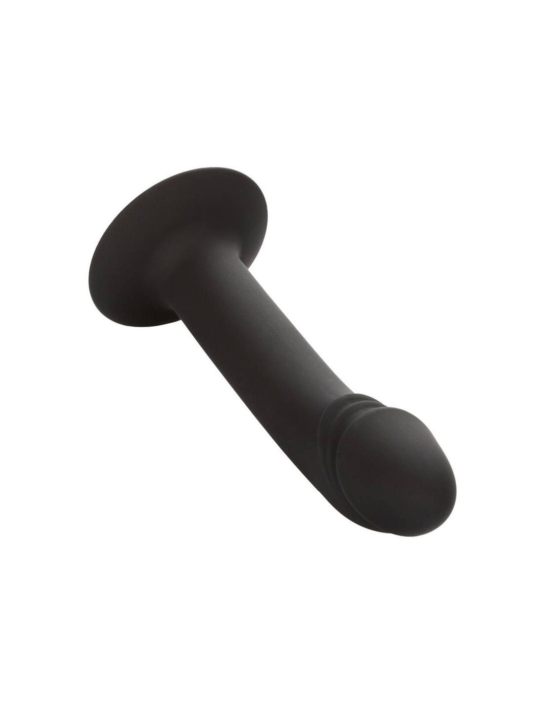 From bashful beginner to erotic expert, the CalExotics Silicone Curved Anal Stud is sure to thrill any backdoor pleasure seekers. The seamless silicone probe has a gently curved shaft, accentuated head, and powerful suction cup base. The curved tip and plump penis head are sure to hit just the right spot every time. The flanged base has a sturdy suction cup that can be used in a harness or mounted to a flat surface for sensational hands-free fun. The flexible probe is made from a smooth, seamless silicone. The body safe material is unscented and phthalate free to keep your most sensitive spots happy and healthy.