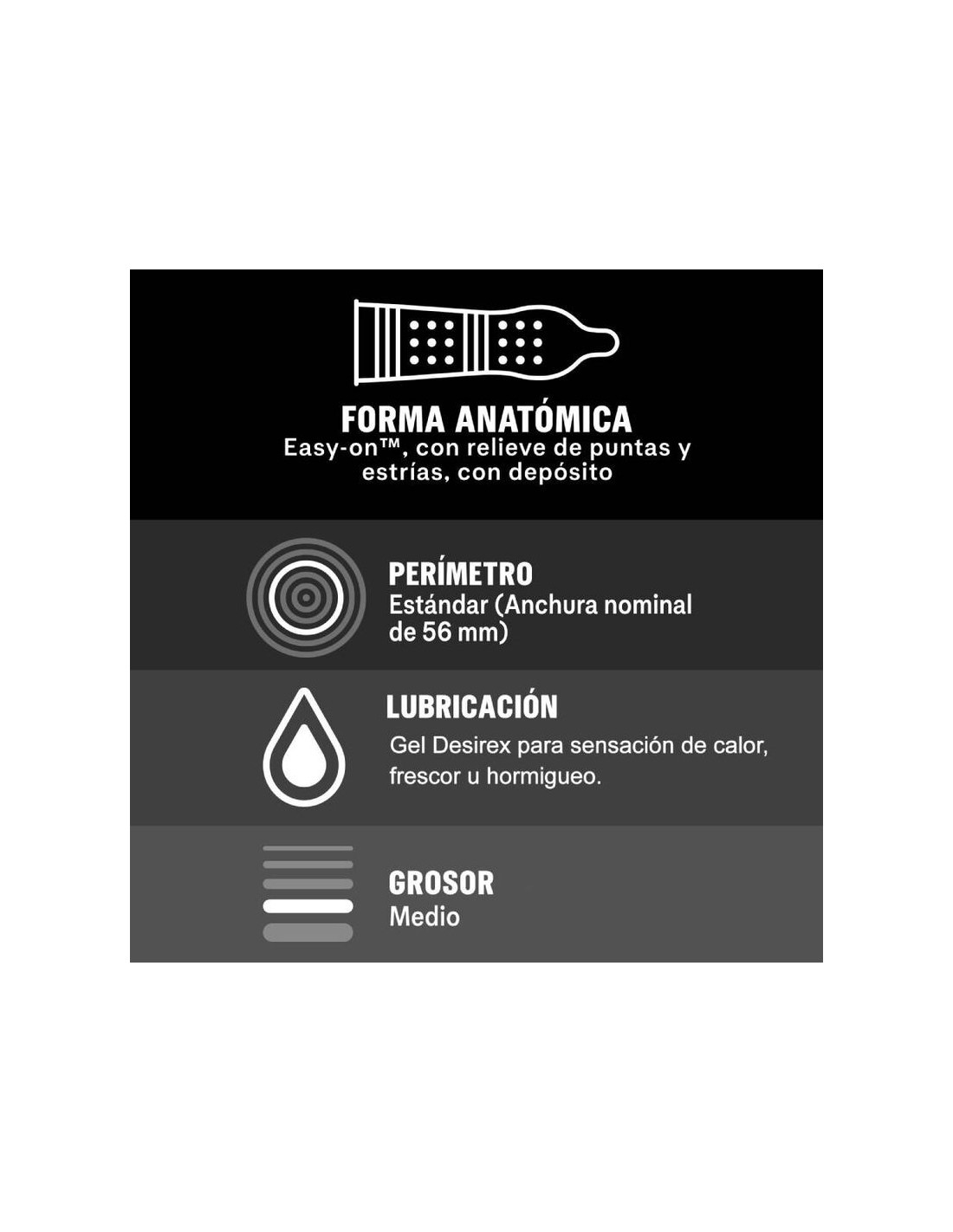 Durex Intense Condoms help make sex better for both, heightening arousal and increasing pleasure. These condoms are lubricated with stimulating gel that increases sensitivity of her intimate areas and brings warming, cooling or tingling sensations, whilst the ribs and dots offer additional stimulation.