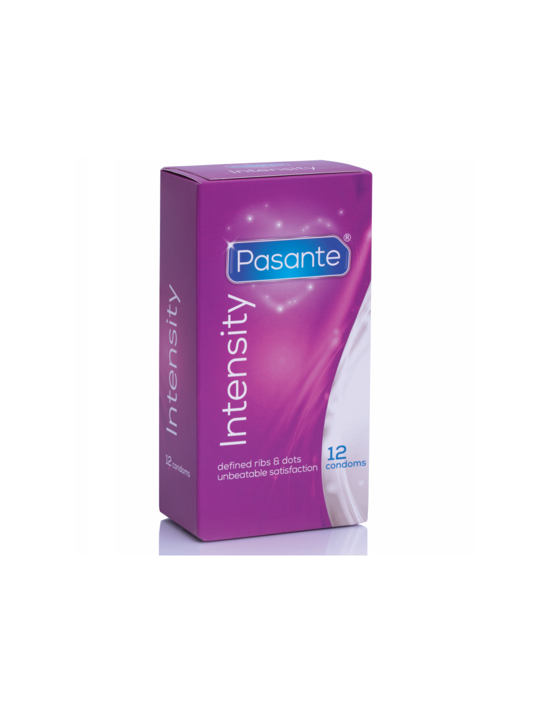 Pasante Ribs & Dots Intensity condoms are tapered, textured condoms with pronounced ribs and dots. Natural in color.