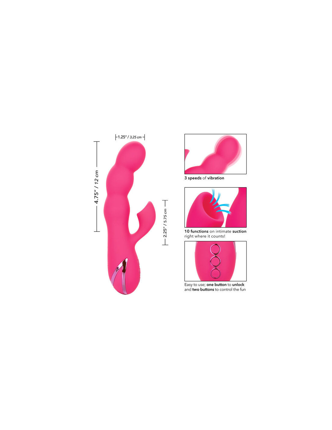 The stimulator has 10 suction functions for wave after wave of orgasmic external stimulation. This dazzling rabbit's quivering shaft uses an intense vibration motor for deeply satisfying internal stimulation. The tickler's flexible vibrations can be used independently of the suction functions for truly customizable pleasure. The knee-shattering twists in this playful setting are not for the faint of heart! Triple power motors deliver deep rumbling vibrations and powerful suction.