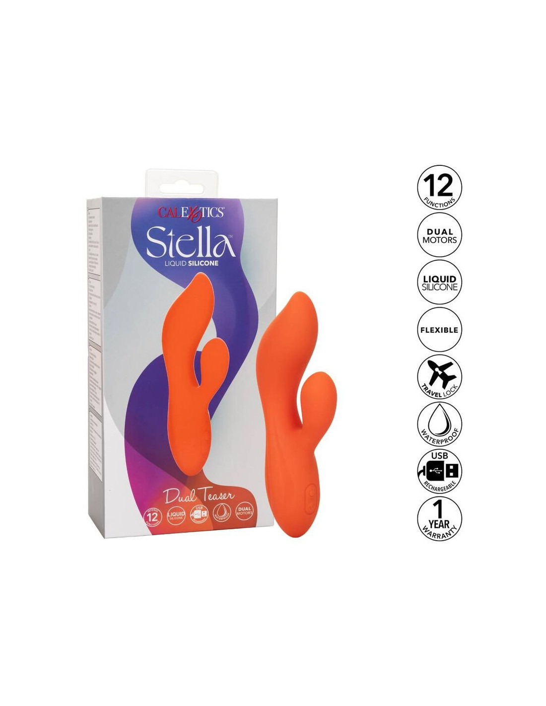 Youll be left breathless at the touch of a button with the stunning Stella Liquid Silicone Dual Teaser. The intimately contoured dual vibe is as thrilling as it is versatile with the uniquely shaped tip, dual motors and 12 indulgent vibration functions. Embrace earth-shaking g-spot stimulation like youve never experienced with the accentuated G stimulator tip and intense dual motor pulsations. This high-powered dual massager is created with a curved g shaft and a naturally contoured stimulator to hug your most intimate curves. An intense motor inside of the flexible shaft and another inside the teaser provide rumbling vibrations for playfully powerful stimulation. Indulge in personalized pleasure while the curved shaft and teaser shimmy to the rhythm of 12 vibration functions. Control this variety of orgasmic options with the easy-touch control button. The flexible massager is made from hygienically superior liquid silicone for a softer, smoother, more durable, and more flexible feel. Whether youre taking a dip with a lover or indulging in a steamy solo session, look forward to up to 110 minutes of waterproof vibration. Recharge pleasure and get back to playtime in only 2 hours with the provided USB cable. To take your pleasure to-go, a security travel lock feature requires you to hold the on/off button for 3 seconds to turn on or off.