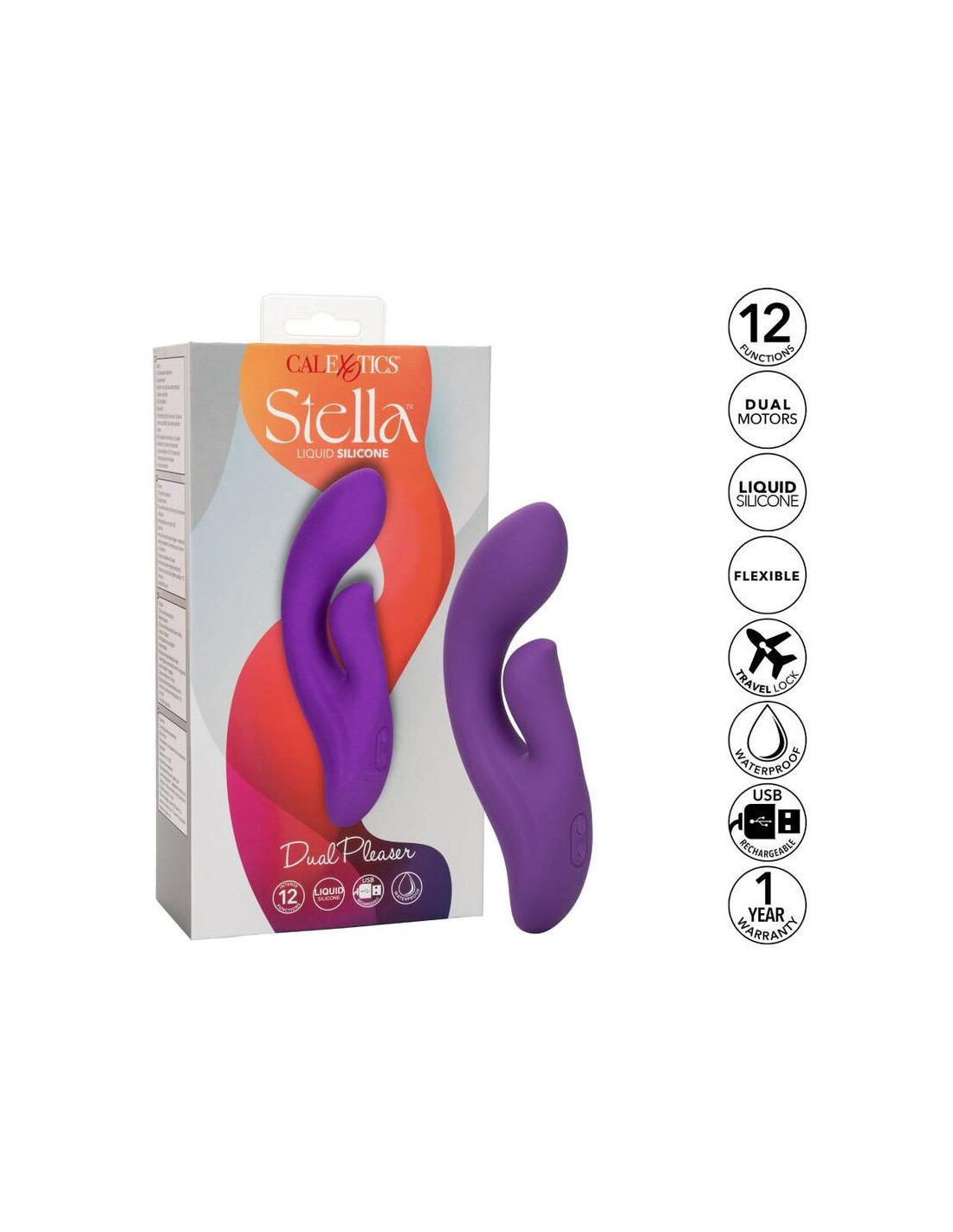 The deep, rumbling power and intimately curved design of the powerful Stella Liquid Silicone Dual Pleaser is sure to leave you breathless. The premium G massager is as thrilling as it is versatile with a uniquely curved tip, dual motors, and 12 rumbling vibration functions. Embrace earth-shaking g-spot stimulation like youve never experienced with the accentuated G stimulator tip and intense dual motor pulsations. This high-powered massager is created with a curved g shaft and a naturally contoured stimulator to hug your most intimate curves. An intense motor inside of the flexible shaft and another inside the teaser provide rumbling vibrations for playfully powerful stimulation. Indulge in personalized pleasure while the curved shaft and teaser shimmy to the rhythm of 12 vibration functions. Control this variety of orgasmic options with the easy-touch control button. The flexible massager is made from hygienically superior liquid silicone for a softer, smoother, more durable, and more flexible feel. Whether youre taking a dip with a lover or indulging in a steamy solo session, look forward to up to 110 minutes of waterproof vibration. Recharge pleasure and get back to playtime in only 2 hours with the provided USB cable. To take your pleasure to-go, a security travel lock feature requires you to hold the on/off button for 3 seconds to turn on or off.