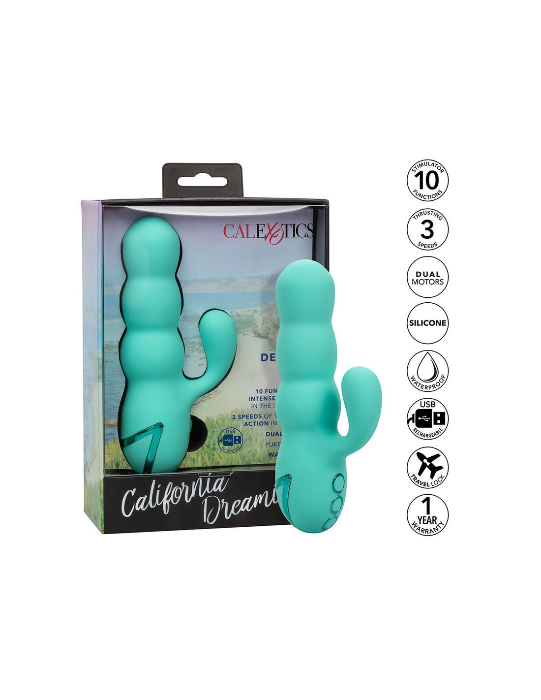 CALEXOTICSThe fun California Dreaming collection makes luxury fantasies come true with the bold Del Mar Diva. The powerful massager is Ready to relive your favorite summer adventure fantasies with 10 powerful vibration functions and 3 knee-shaking thrusting speeds. While the flashing stimulator teases, the bulbous shaft and rounded tip provide deep thrusting stimulation. The shaft has a powerful pushing action to ensure you always get to the right place. The rumbling tickler uses a powerful vibration motor to provide wonderful external stimulation. The flexible teaser can be used independently of the thrusting function for fully customizable pleasure. The knee-shaking turns in this fun environment are not for the faint of heart! The dual-power motors emit deep vibrations and powerful thrust. Plug the provided USB cable into the self-sealing charging port to recharge your passion in 2.5 hours. Get excited with up to 90 minutes of intense pleasure. For effortless control of stimulation, the sleek 3-button control panel allows you to independently operate the vibration and thrusting options. The high-tech memory chip remembers exactly how you like it and resumes playback with the last function used.