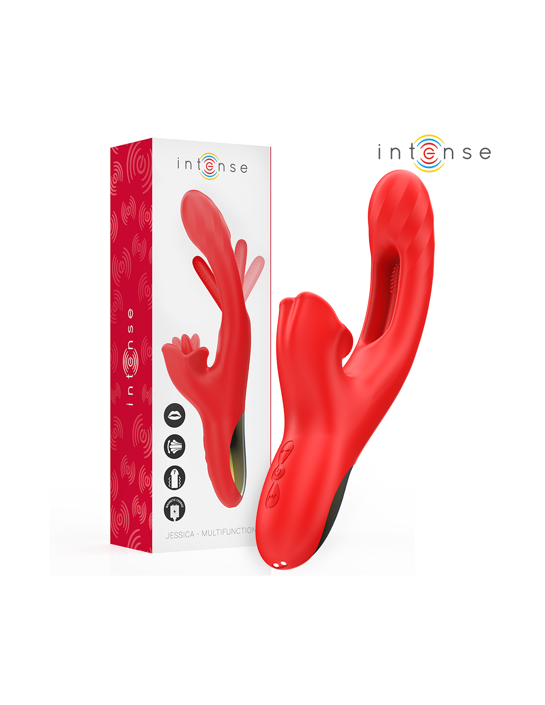 INTENSE HIGH TECHThe INTENSE Jessica vibrator is a masterpiece of multifunctional pleasure, designed for those seeking deep, external and internal stimulation with the latest technology. This innovative model stands out for offering a complete experience thanks to its rotary licking clitoral stimulation, combined with internal oscillation and powerful vibration, all managed by 3 independent motors.