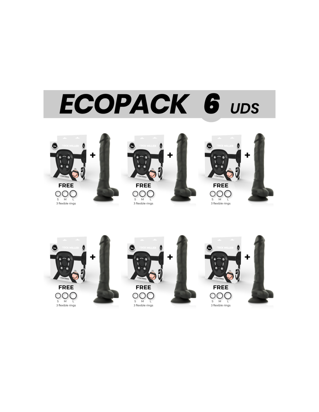 ECOPACK 6 UNITS - COCK MILLER HARNESS SILICONE DENSITY ARTICULABLE BLACK COCKSIL 24 CM