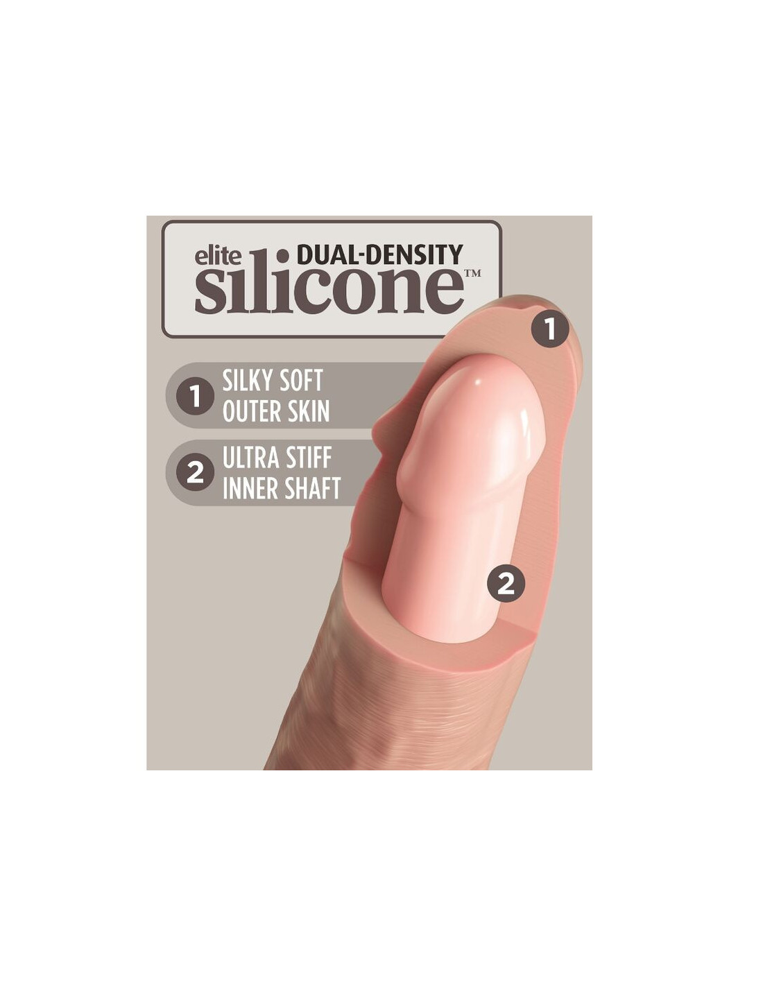 The solid suction cup has been designed for superior performance, giving you more versatility and comfort during use. The suction cup also makes this King Cock Elite Dual Density Silicone Dildo Be compatible with Body Dock and harness if desired.