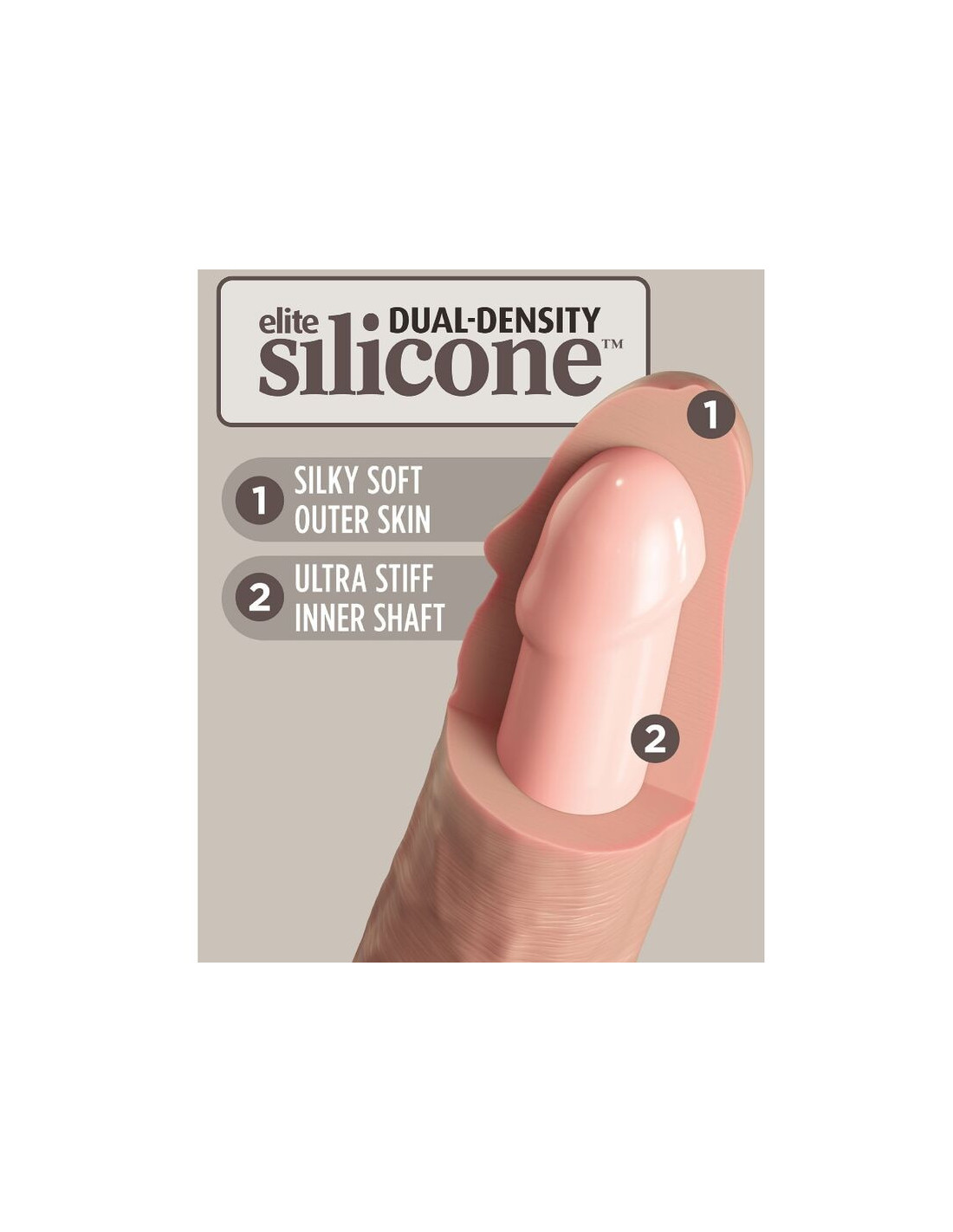 The solid suction cup has been designed for superior performance, giving you more versatility and comfort during use. The suction cup also makes this King Cock Elite Dual Density Silicone Dildo Be compatible with Body Dock and harness if desired.