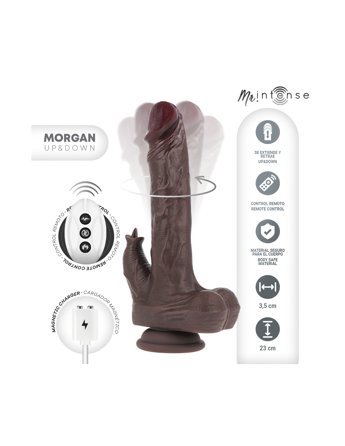 MR. INTENSE HIGH TECHLet yourself be carried away by an intense and realistic experience with MORGAN, the star dildo of the MR INTENSE collection. Designed for lovers of powerful and deep pleasure, this realistic vibrator combines hyper-realistic aesthetics with internal mechanics that simulate the natural movement of vertical thrusting (Up & Down) for completely immersive sensations. With a flexible shaft of 23cm in total length and 16cm insertable, and an average diameter of 3.5cm, MORGAN offers a solid and satisfying presence without compromising comfort. Its body is Covered in super-soft, high-quality, body-safe silicone with a silky feel that mimics real skin.