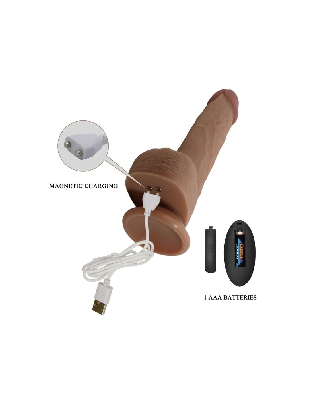 A realistic penis shaped thrusting and vibrating vibrator with a strong suction cup that sticks to any smooth surface. The suction cup makes hands-free fun possible.