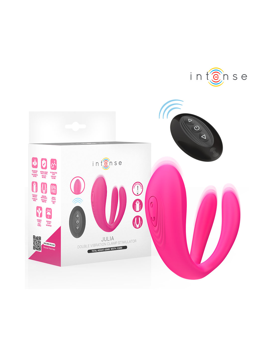 INTENSE REMOTE CONTROLIndulge in sensuality and innovation with Julia, the new vibrator and stimulator from Intense, designed to offer personalized pleasure and absolute control. Thanks to its ergonomic and flexible design, it easily adapts to the female anatomy, precisely stimulating the body's most sensitive areas.