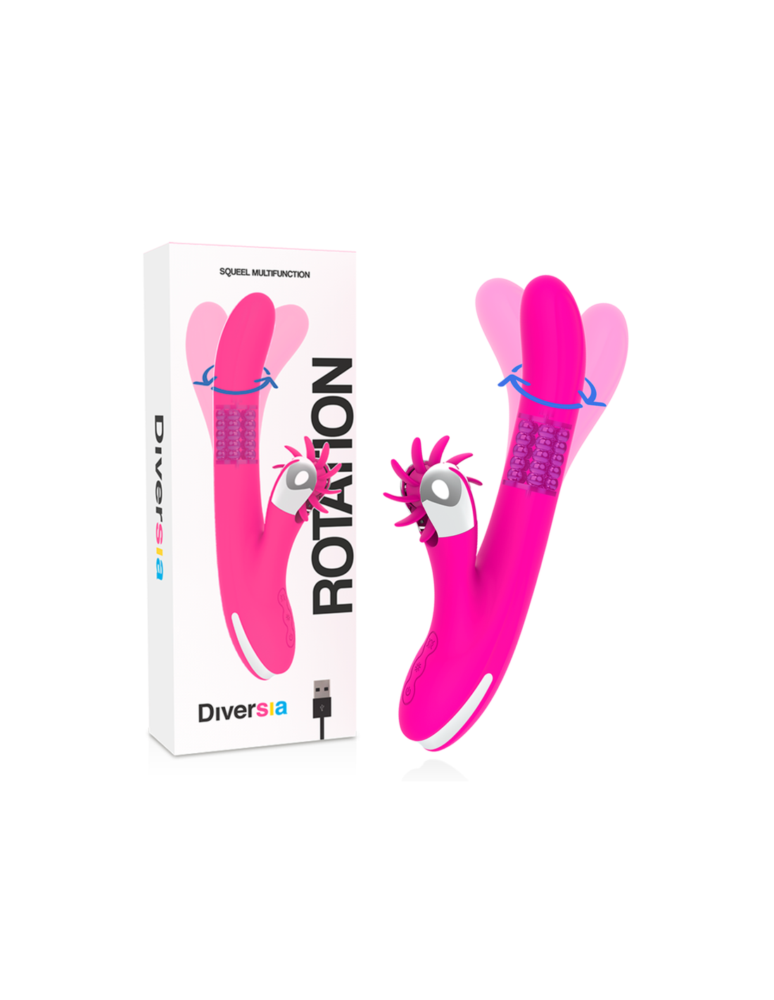 The DIVERSIA BUNNY ROTATION range incorporates a base of soft rotating pearls and an oscillating curved head that will take you to climax, thanks to contact with the G-spot.