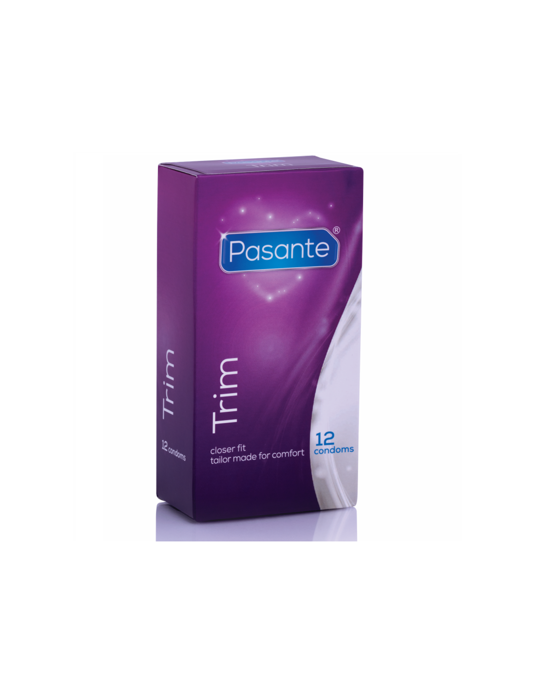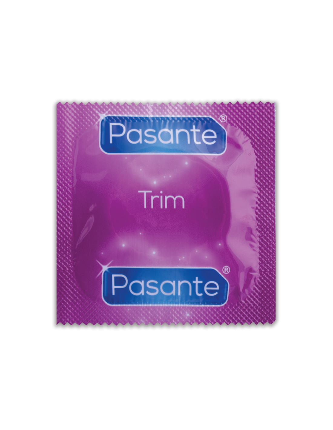 Pasante Trim condoms offer a narrower width for a smaller fit. Parallel, smooth, natural color.