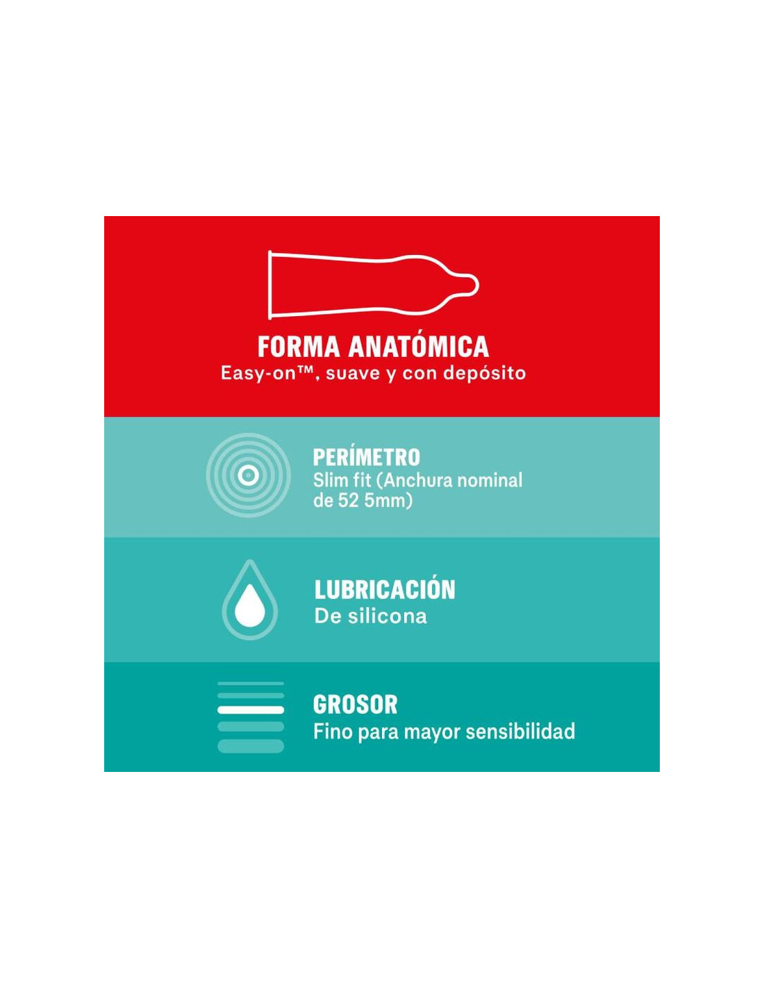 - EASY-ON: Easy-On soft latex condoms with anatomical shape with deposit.