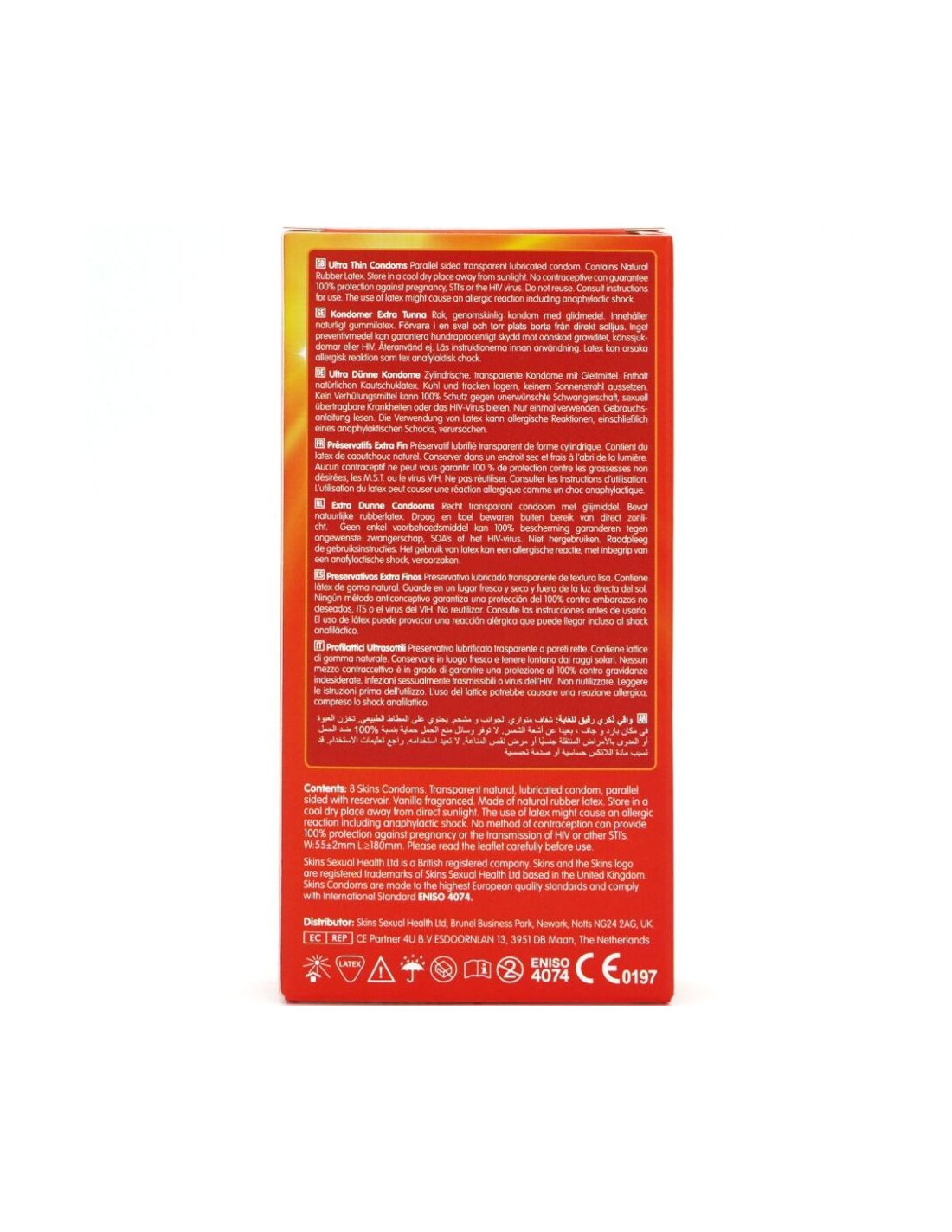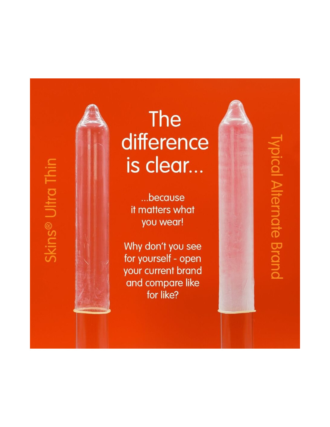 Introducing the Skins Ultra Thin 8-Pack - a value-priced, ready-to-use product that offers up to 33% more condoms per pack than the market leader. Designed for customers seeking ultimate intimacy with reliable protection, this pack is ideal for retailers looking for a premium, high-performance essential. Skins Ultra Thin condoms offer all the benefits of Skins Natural, but with an even thinner design for an even more intimate feel. Made with premium natural latex, they offer strength, transparency, and a second-skin feel, making them the ideal choice for those who prioritize sensation. Feel even closer to your partner with the Skins Ultra Thin condom, strong yet incredibly thin. With all the features of Skins Natural, but even thinner, wearing a Skins Ultra Thin feels like a second skin.
