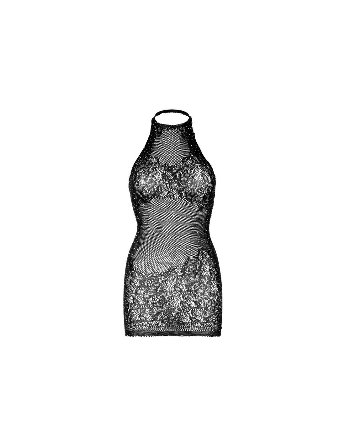 Figure hugging lace and net halter mini dress covered with rhinestone.