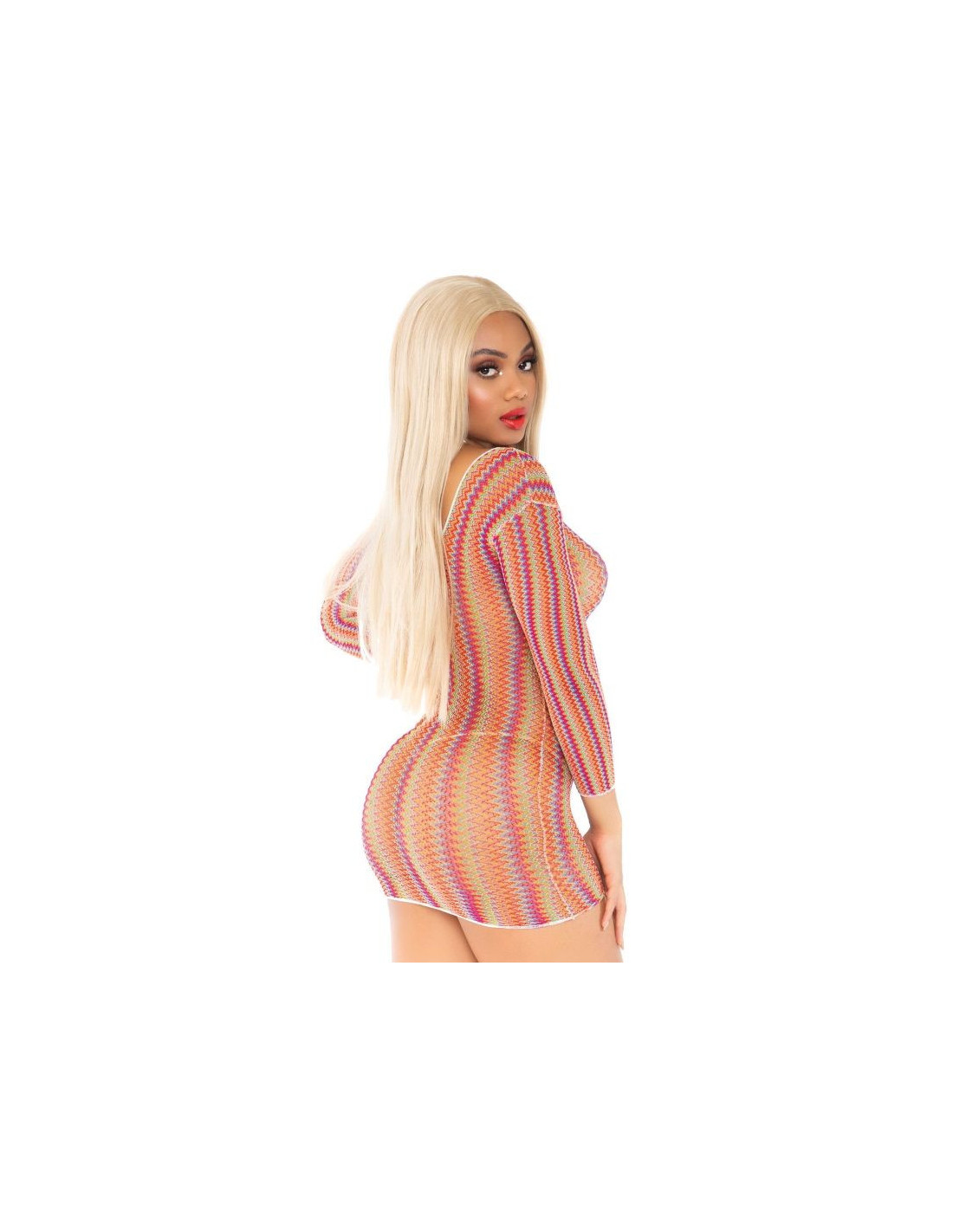 Zig zag rainbow net long sleeve mini dress manufactured by the prestigious lingerie brand, Leg Avenue. Increase your feminity getting an exclusive piece of seduction sensuality and elegance.