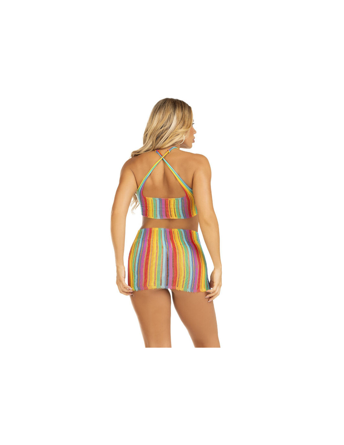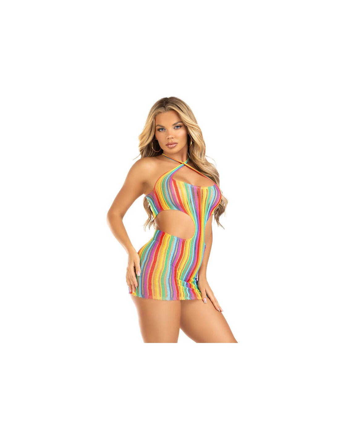 The rainbow stripes that adorn the dress create a vibrant and cheerful visual effect. The combination of bright and bold colors evokes a feeling of positivity and happiness, perfect for summer days or to liven up your look at any time of the year.