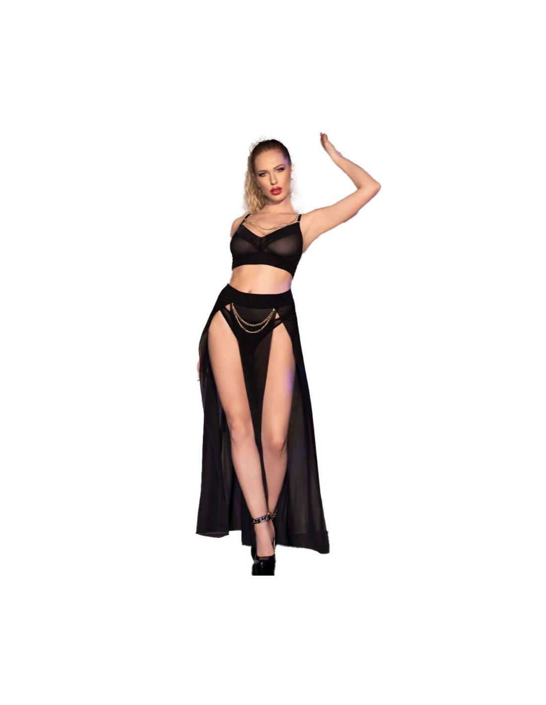 CHILIROSE - CR 4672 BLACK TOP SKIRT AND THONG WITH GOLDEN CHAINS S