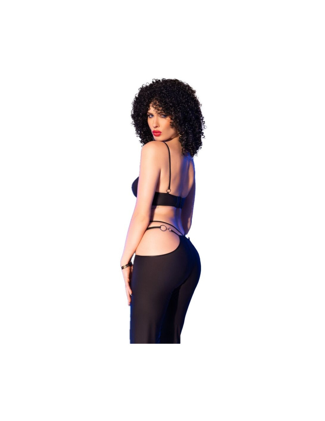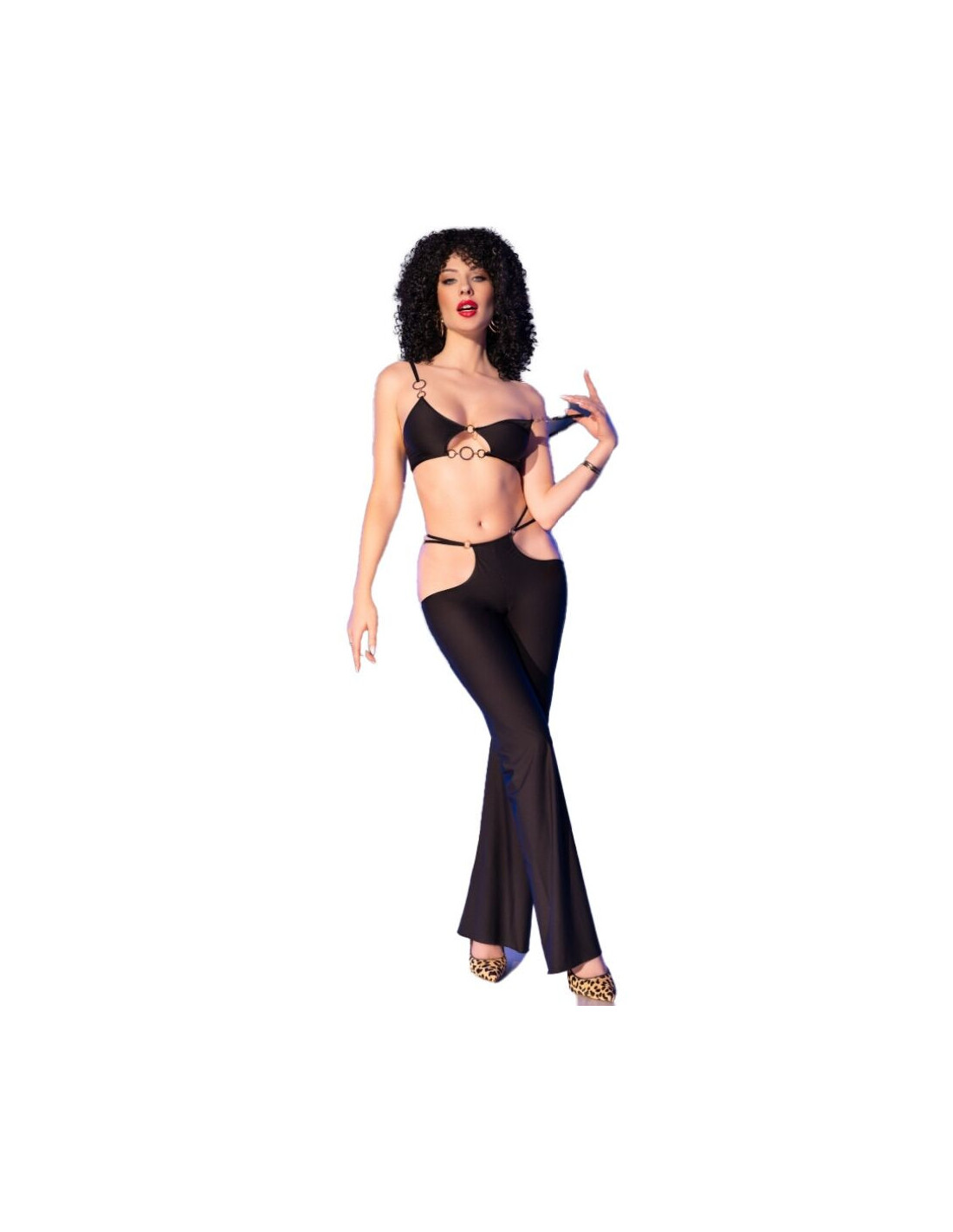 The top, adorned with gold rings, adds a touch of elegance, while the pants, with playful side cuts, subtly reveal the hips, provocatively drawing attention.