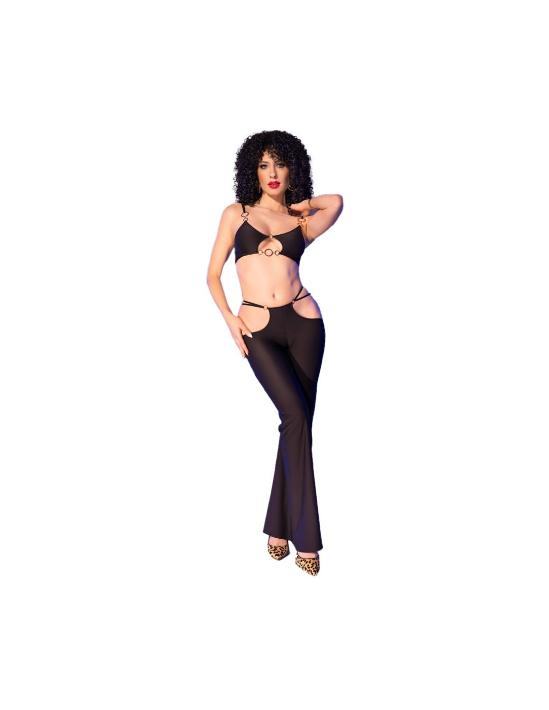 The top, adorned with gold rings, adds a touch of elegance, while the pants, with playful side cuts, subtly reveal the hips, provocatively drawing attention.