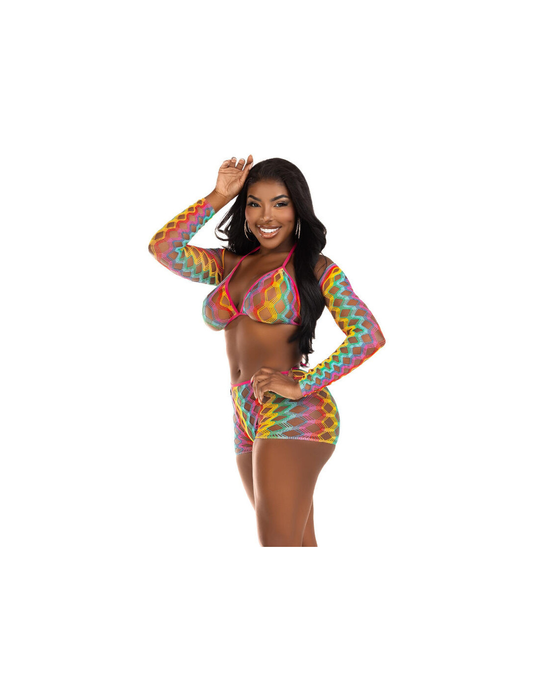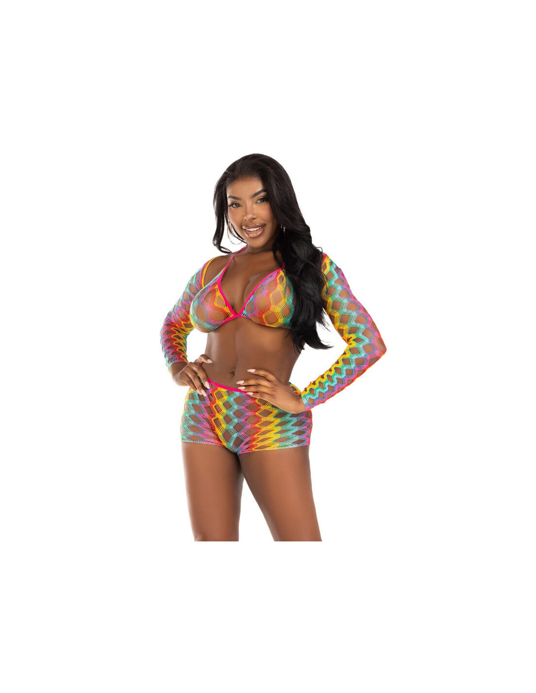 The three-piece set of top with bra, bolero and mesh shorts in rainbow color is an explosion of style and fun. Designed for those who want to stand out and express their vibrant personality, this ensemble is a bold statement of fashion and originality.