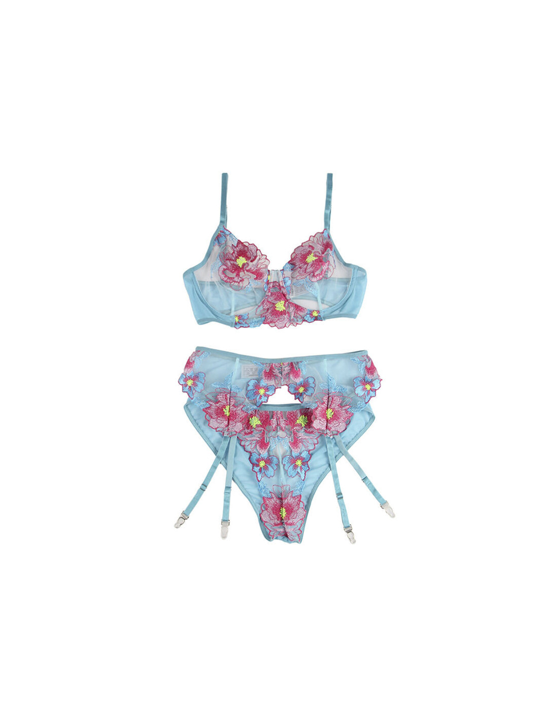 SUBBLIME - 954109 BRA PANTIES WITH GARTER BELT FLORAL DESIGN BLUE S-M
