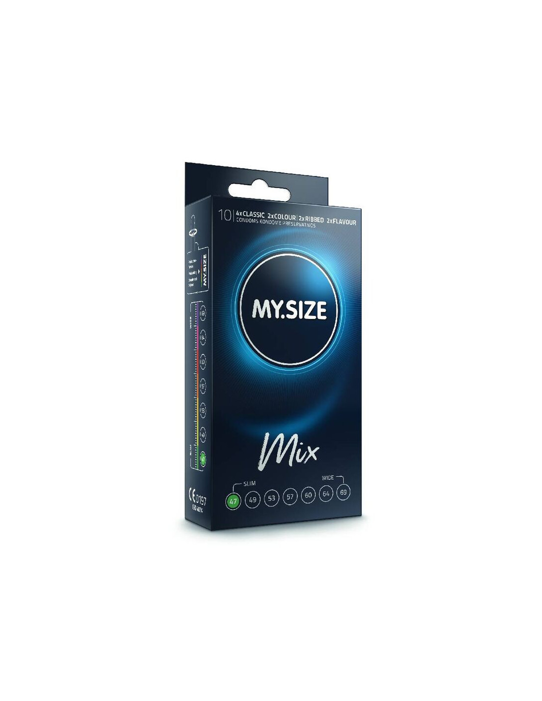 - THE DEAL: 10 MY.SIZE condoms in 4 variations: 4 Classic, 2 Ribbed, 2 Flavor, 2 Color. 47mm. CE marking. In compliance with EU Directive 93/42/EEC on medical devices. Available in other nominal widths. Free online gauging app included.