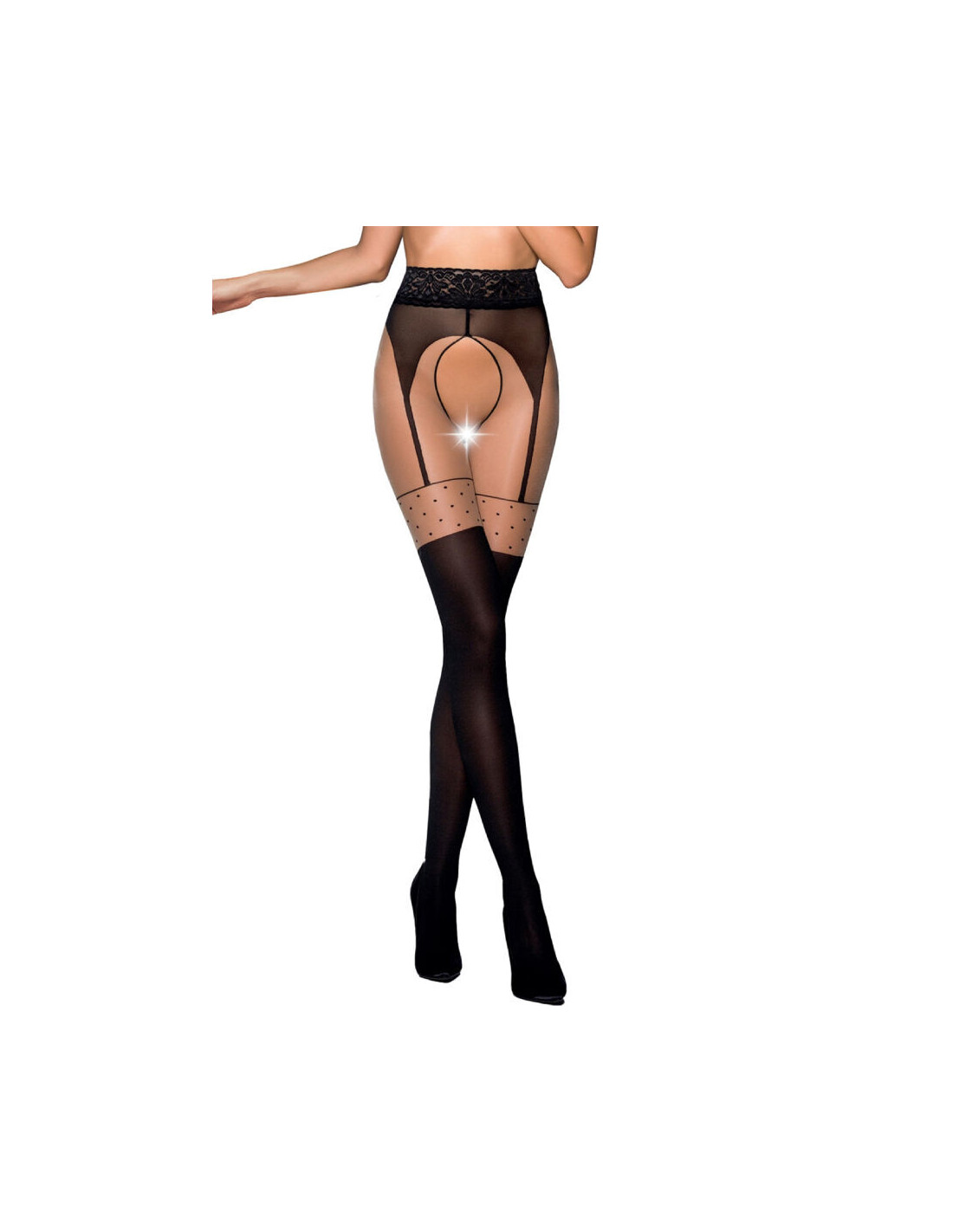 The unique combination of classic stockings with a faux garter belt is the perfect choice for women who are bored of traditional stockings under a skirt or dress. The luminous stockings are decorated with charming polka dots.