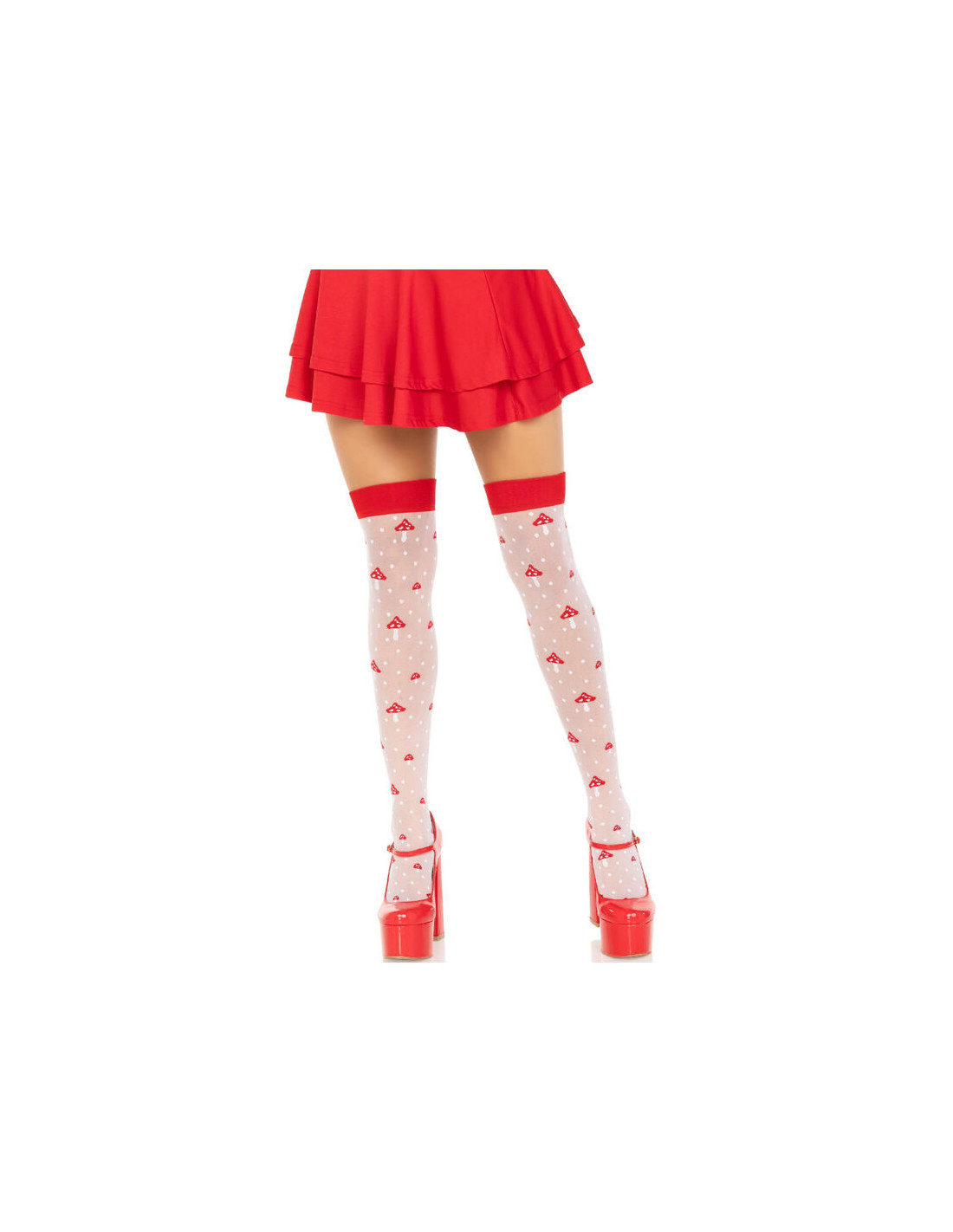 These thigh-high stockings are a lingerie garment that combines the elasticity and comfort of spandex with a fun and distinctive design. Their polka dot and mushroom pattern, along with their perfect fit and elegant thigh-length finish, make them a versatile and attractive option for any occasion, adding a touch of whimsy to your look. a and sophistication to any wardrobe.