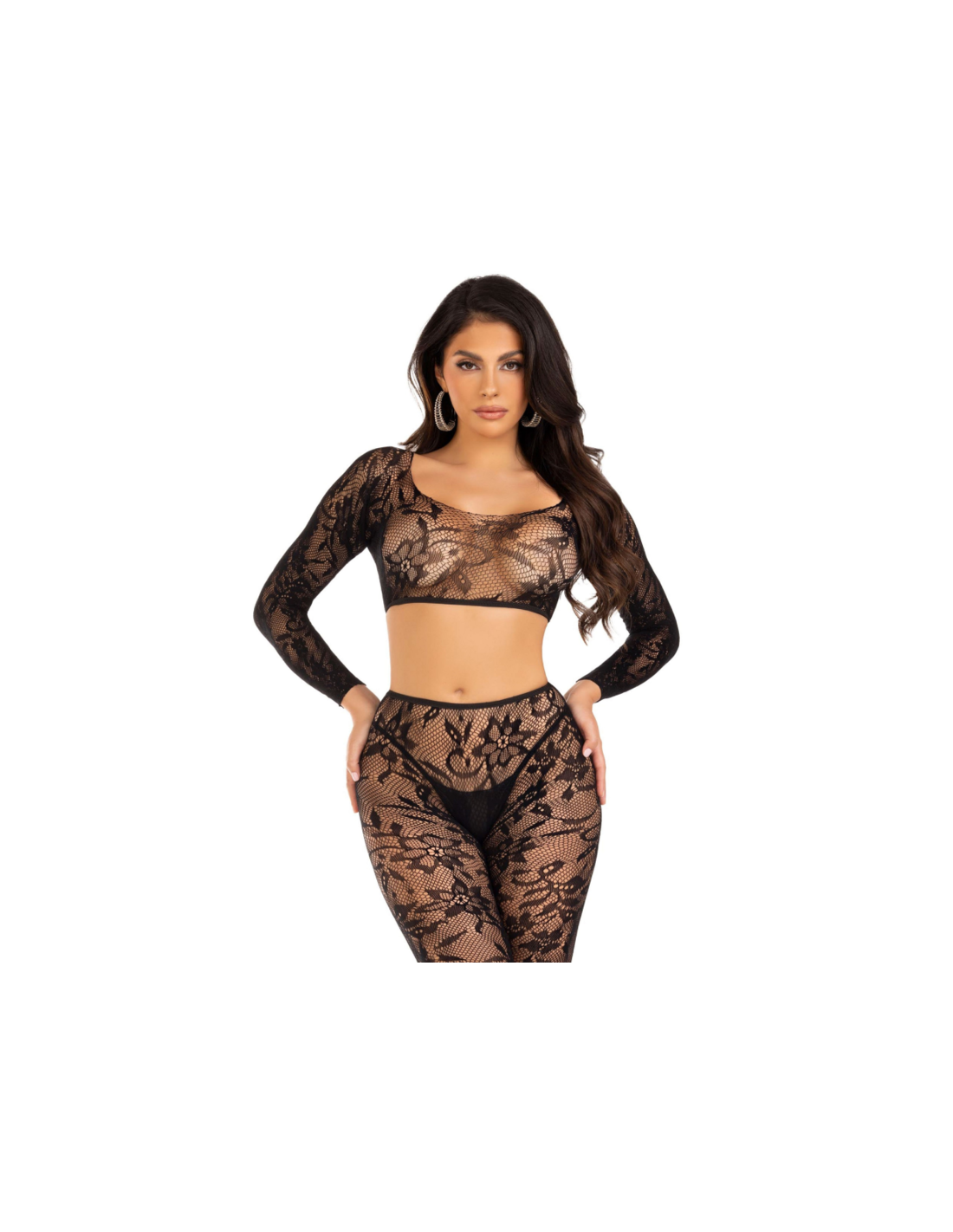 The seamless Chantilly lace crop top and footless tights are a sensual and sophisticated combination that offers effortless, elegant style.