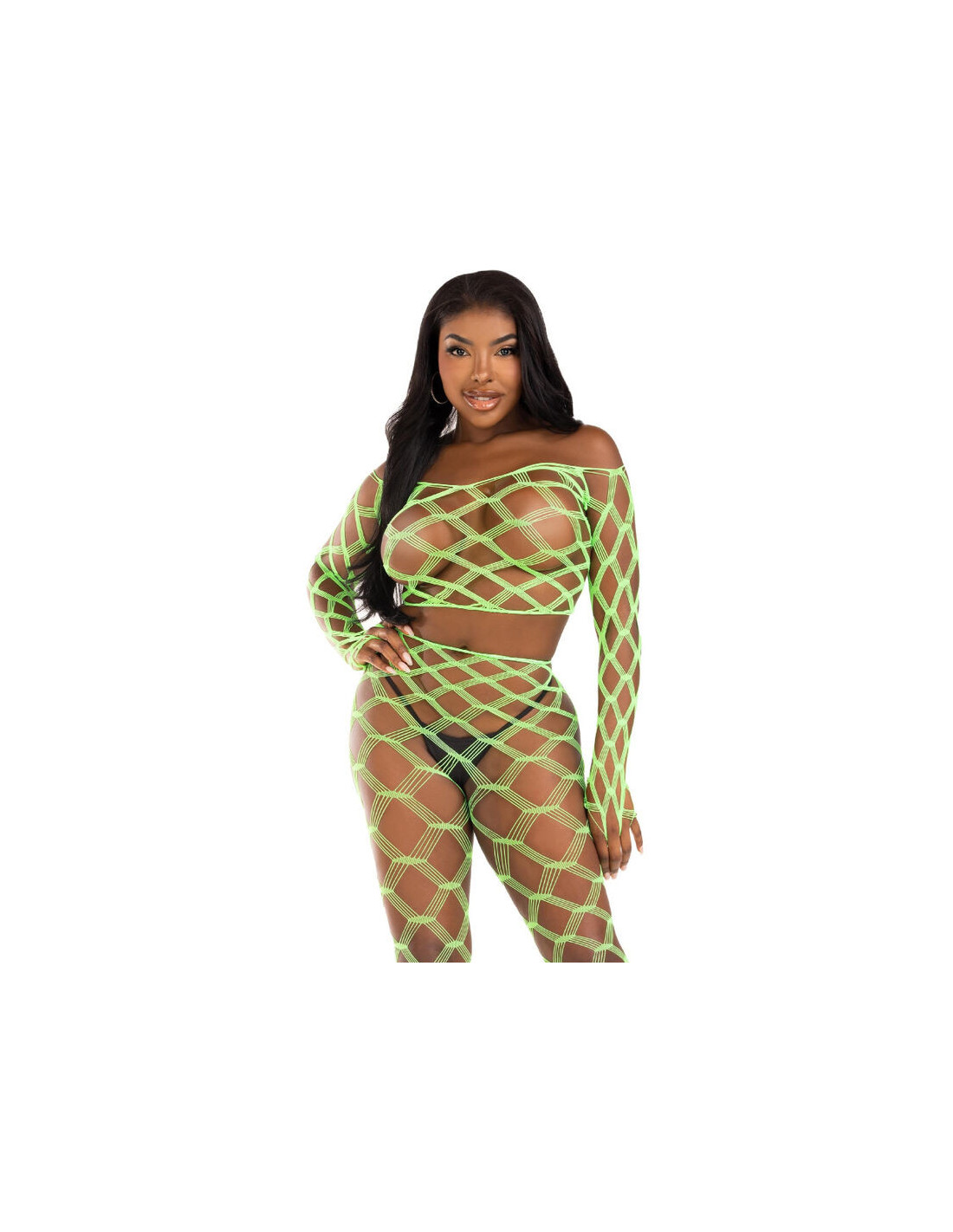 The 2-piece hardcore fishnet crop top with footless stockings is the perfect option for a special night or to surprise your partner. Its bold and seductive design will make you fall in love. You will feel confident and powerful, while its softness and elasticity will keep you comfortable and ready for any intimate occasion. It is the ideal choice for those who want to express their sensuality and style with confidence and boldness.
