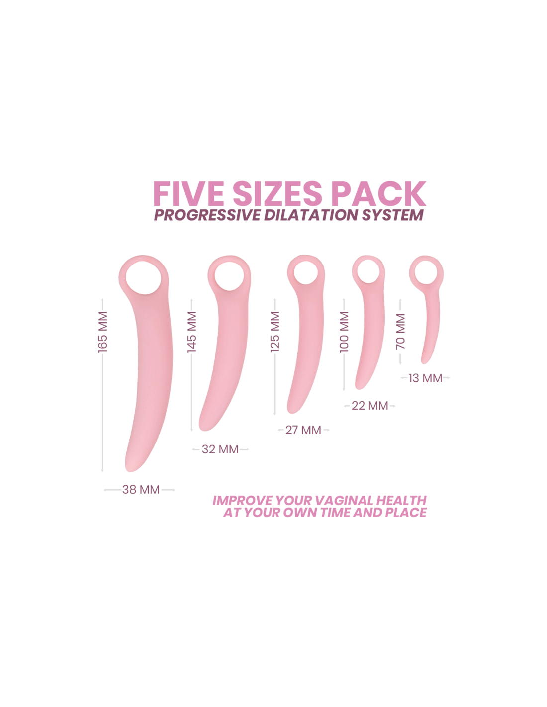 INTIMICHIC silicon dilator allows you to exercise and progressively dilate the vaginal canal. It allows at the same time through small daily exercises to lose the fear of penetration. It is composed of three elements with a perfectly ergonomic shape and different sizes to palliatively solve this disorder with harmful effects on sexuality and psychological health in general.